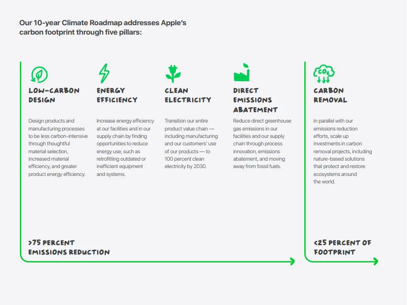 그 중 우리에게 친숙한 브랜드, 애플에서는 탄소 배출을 줄이는 방안으로 5가지의 핵심 개념을 수립하여 10년 간의 탄소 배출량 감소를 목표를 세웠어요!