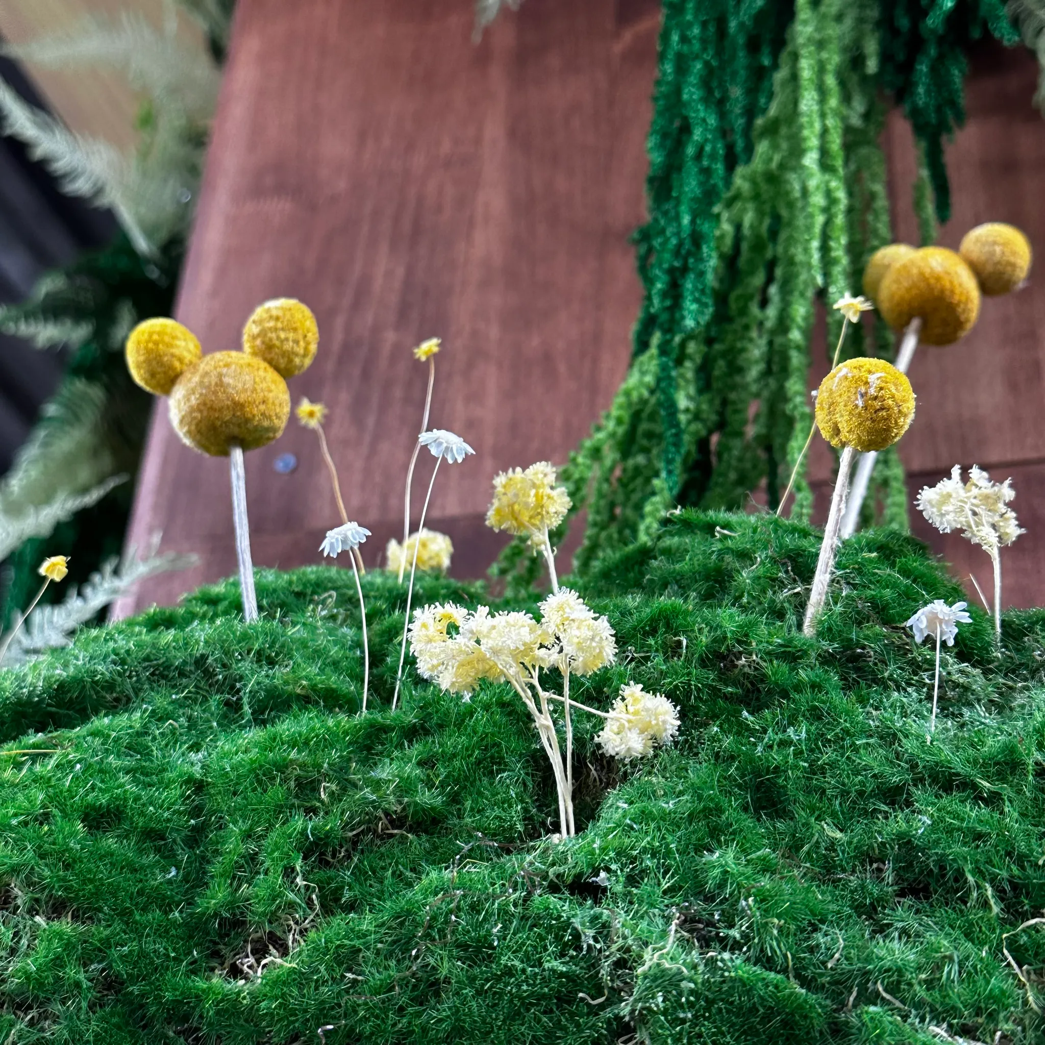따뜻한 무드가 느껴지는 목재 프레임과 플랜테리어를 활용하였습니다. 목재와 플랜테리어가 자연스럽게 어우러져, 공간 전체에 조화와 통일성을 부여하였습니다. 플랜테리어의 경우, 특히 동산과 테라코타 화분 등을 배치하여 자연적인 무드를 강조하였고, 미키 마우스 형태의 이끼볼 등 재치있는 오브제가 함께 어우러져 흥미로운 공간을 표현하였습니다.