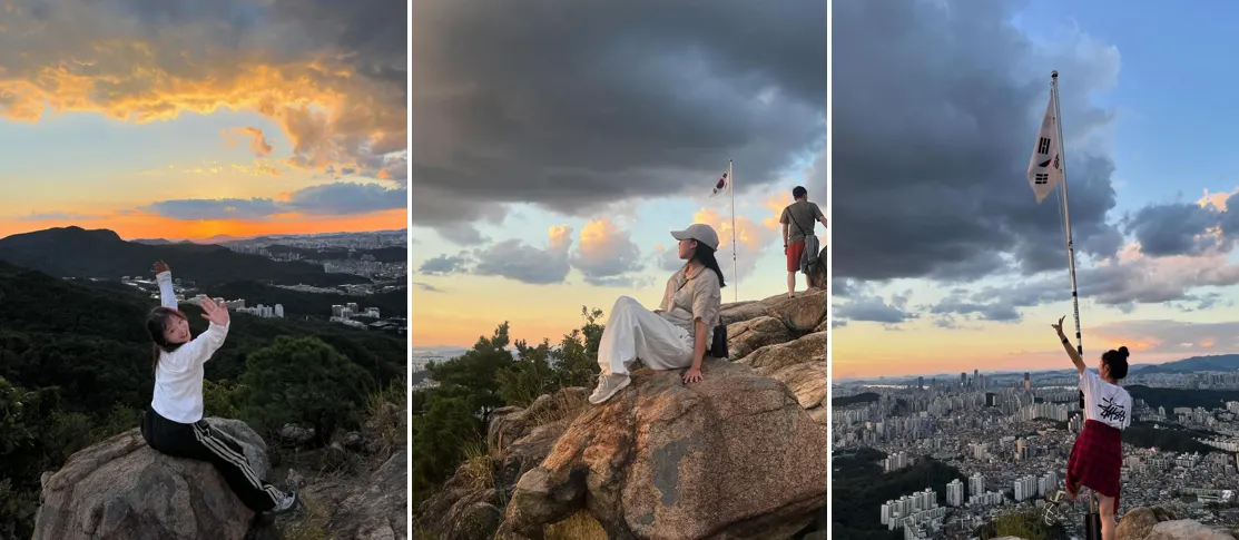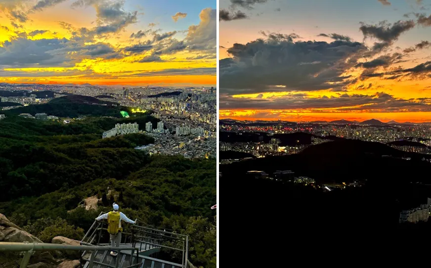 붉은 노을에 산 아래로 훤하게 내려다 보이는 게 너무 예쁘지 않나요? 🥹 맑은 하늘과 푸르른 산을 보니 더더욱 자연이 영원했으면 좋겠다는 생각이 더 커졌어요!
