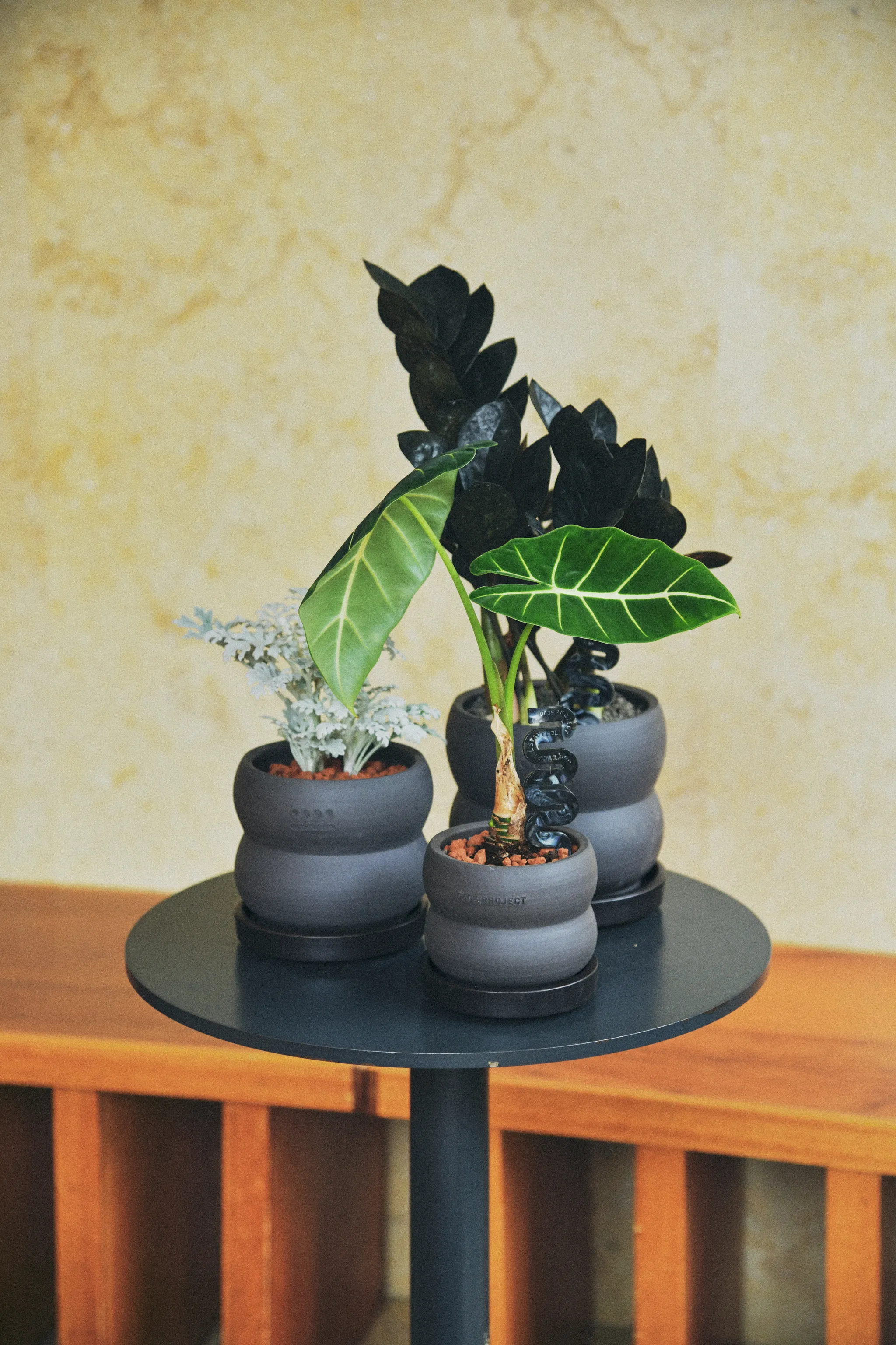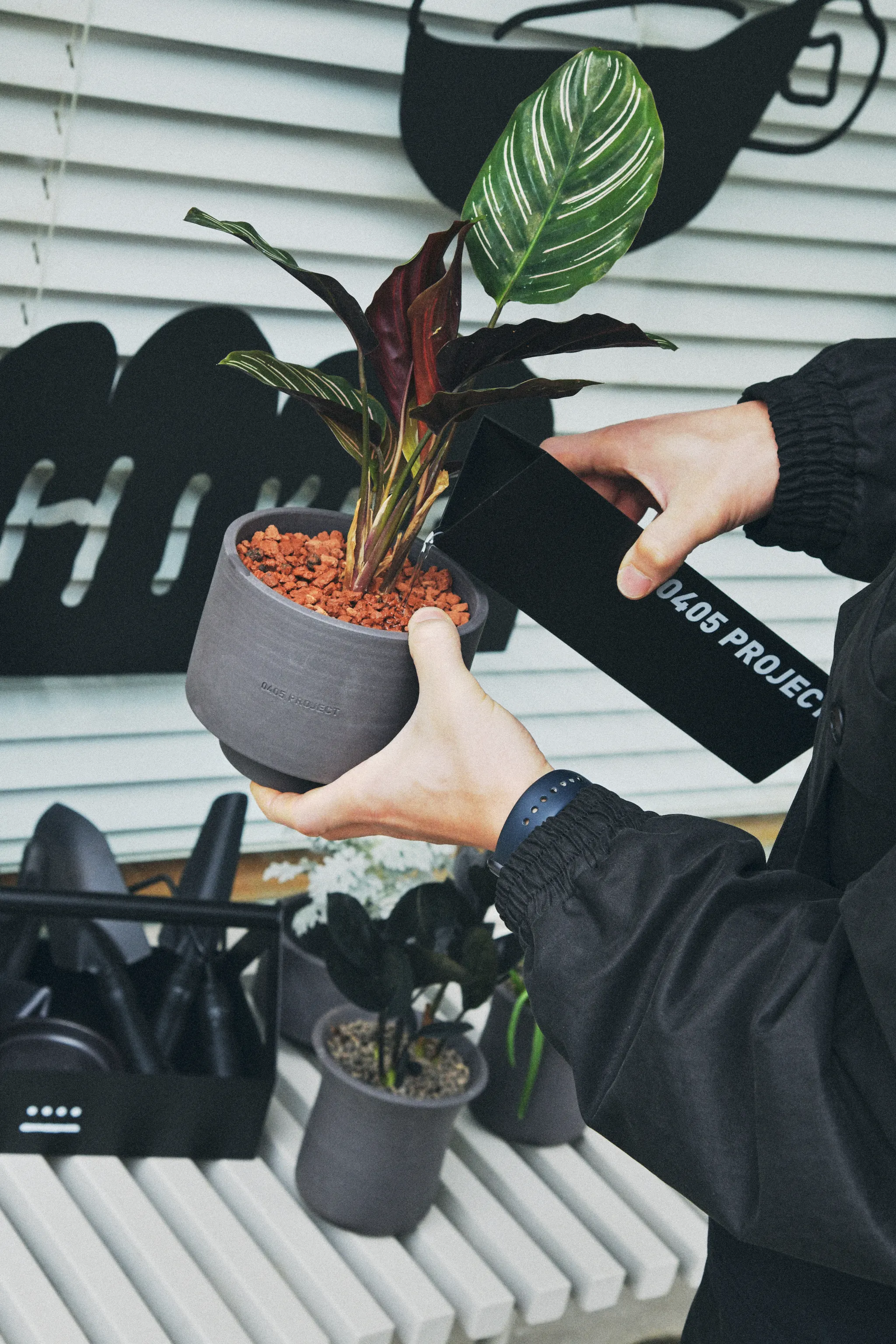 0405 PROJECT의 컨셉과 잘 맞는 차분한 느낌과 컬러감의 식물들을 준비했습니다. 뾰족한 잎이 매력적인 아라리라, 잎의 무늬가 방울뱀을 닮은 칼라데아 인시그니스, 벨벳 질감의 잎이 매력적인 알로카시아 벨벳, 시크한 잎이 매력적인 블랙금전수… 그 외에도 평소에 만나기 힘들었던 독특하고 귀여운 외모의 다육이들과 멋진 수형의 작은 분재도 준비하고 있답니다