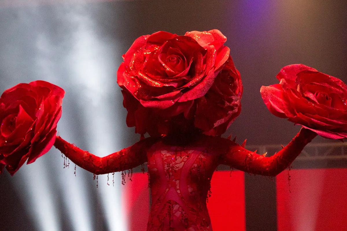 그 중에는 꽃을 활용한 의상도 있었는데요. 머리와 양손이 강렬한 레드 장미 봉오리인 형태, 그리고 온 몸이 하나의 묘한 식물의 형태로 초록색 몸에 형형색색, 다양한 크기의 꽃으로 만든 의상도 있었습니다. 공연 뿐만 아니라 의상 자체도 아름답기에 패션 디자이너로서 작품 의상을 판매하기도 하는 올가 사레츠키를 보며, 마초의사춘기도 소재나 연출법에 대해 가지고 있는 고정관념에서 벗어나 새롭고 재밌는 시도를 할 수 있는 포인트를 가져가야겠다는 생각을 합니다.
