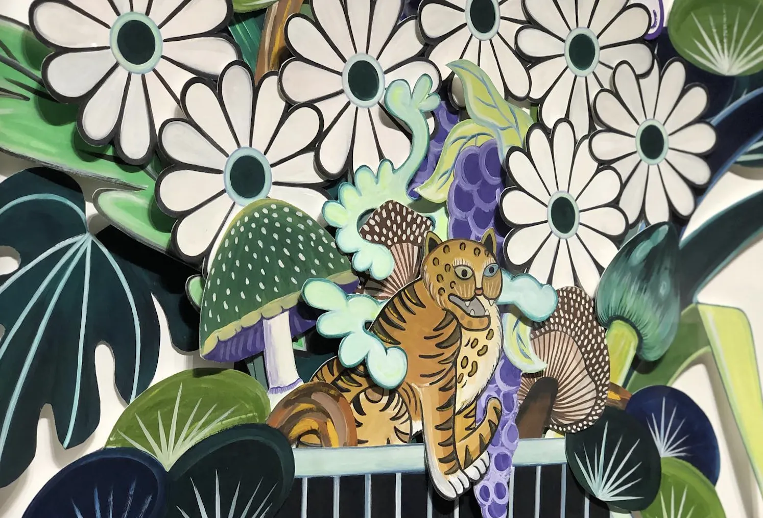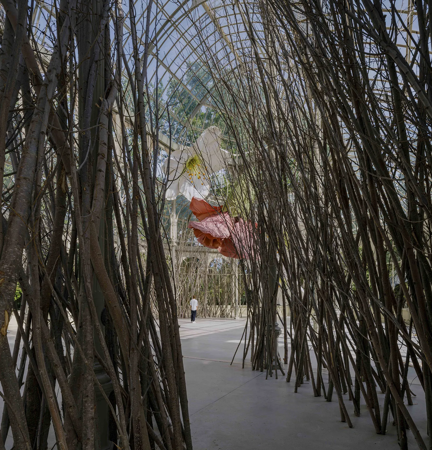 2021년 2월 28일, 마드리드의 Palacio de Cristal이라는 궁전에서는 거대한 대형꽃과 함께 Petrit Halilaj 작가의 첫 개인전이 열렸습니다. 이 전시는 바우어라는 새의 수컷이 짝에게 구애를 할 때 정교하게 둥지를 장식하여 유혹을 하는 독특한 구애 의식에서 영감을 받았다고 합니다. 궁전을 일종의 사랑을 기념하는 은유적 둥지로 표현하였는데, 이를 대형화하여 마치 거대한 새의 둥지에 들어온 듯한 느낌을 주었습니다. 그렇게 궁전 내부에는 개나리, 벚꽃, 양귀비, 카네이션, 백합 등이 초대형 페이퍼 플라워로 존재하며 곳곳에 새의 발 한 쌍이 설치되어 대형화된 느낌을 극대화 하였습니다.