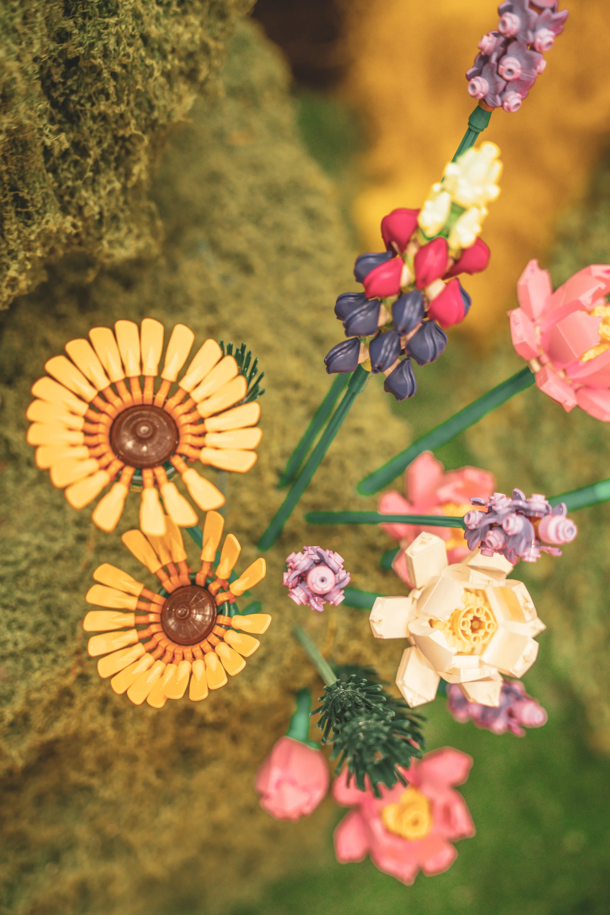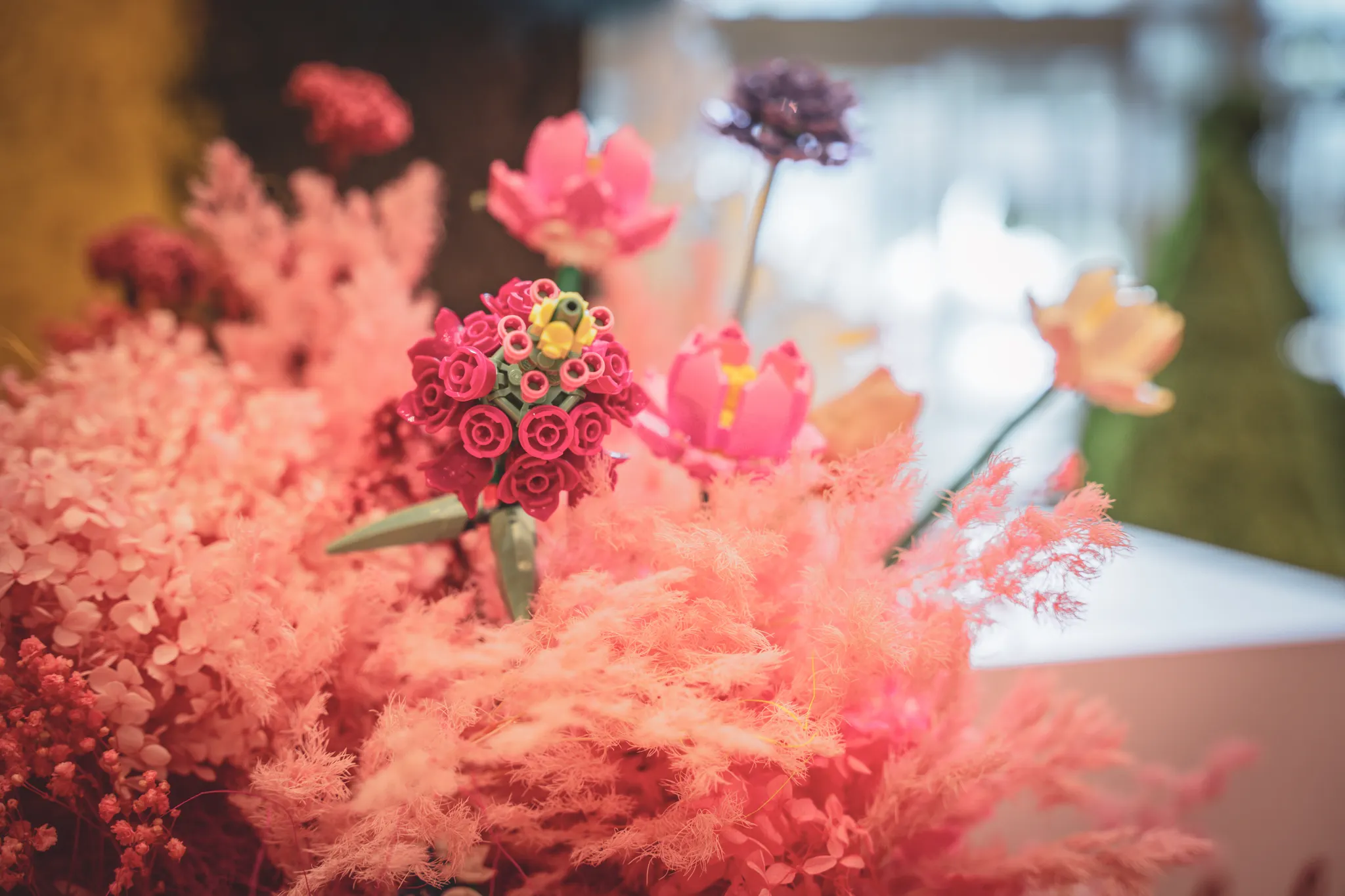 다양한 질감, 컬러의 스퀘어 오브제를 켜켜이 쌓아 마운틴의 형상으로 표현, 레고의 결합 방식과 꽃을 지면에 어레인지 하는 방법을 연계한 디자인 형태 연출합니다.