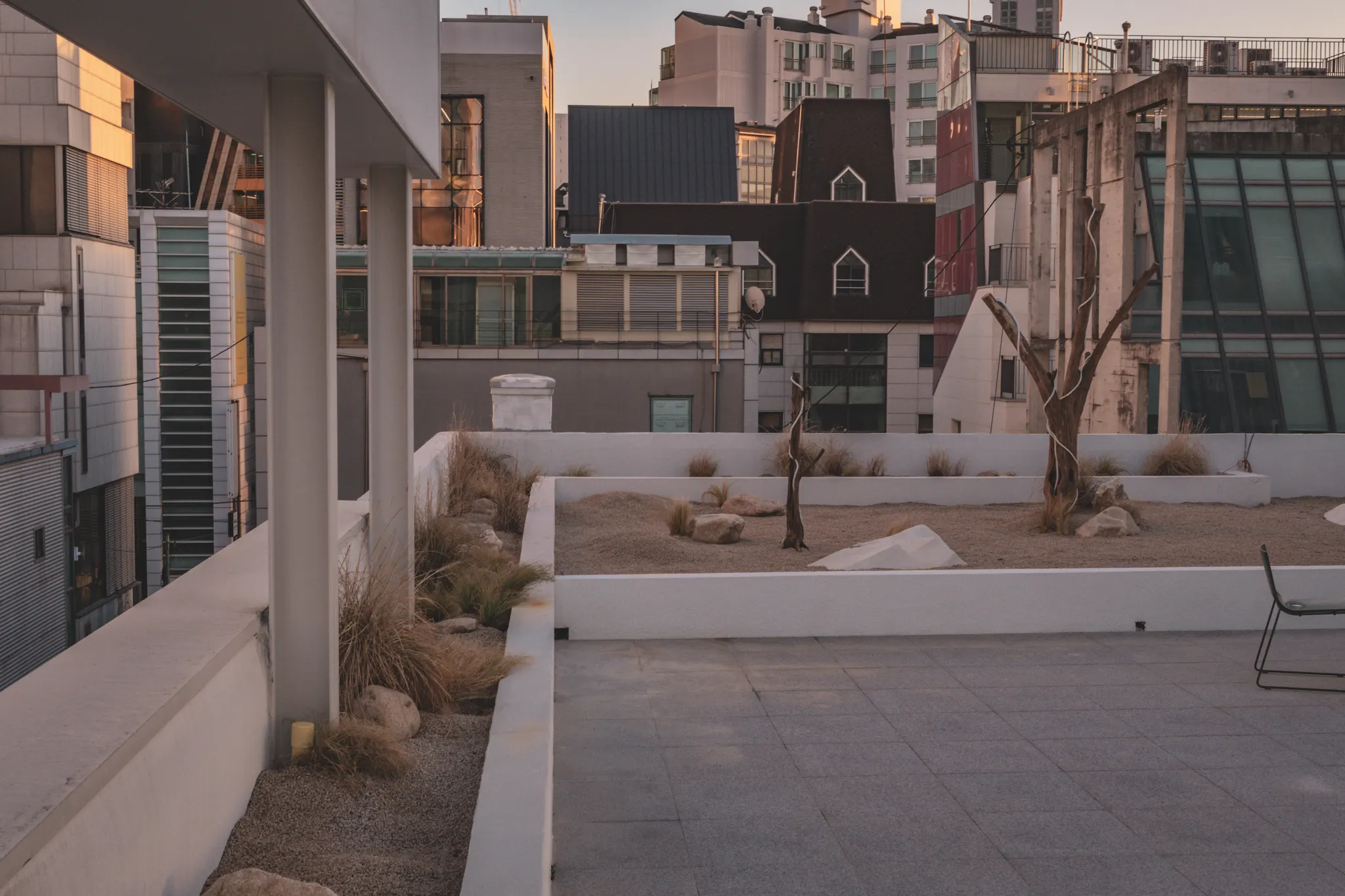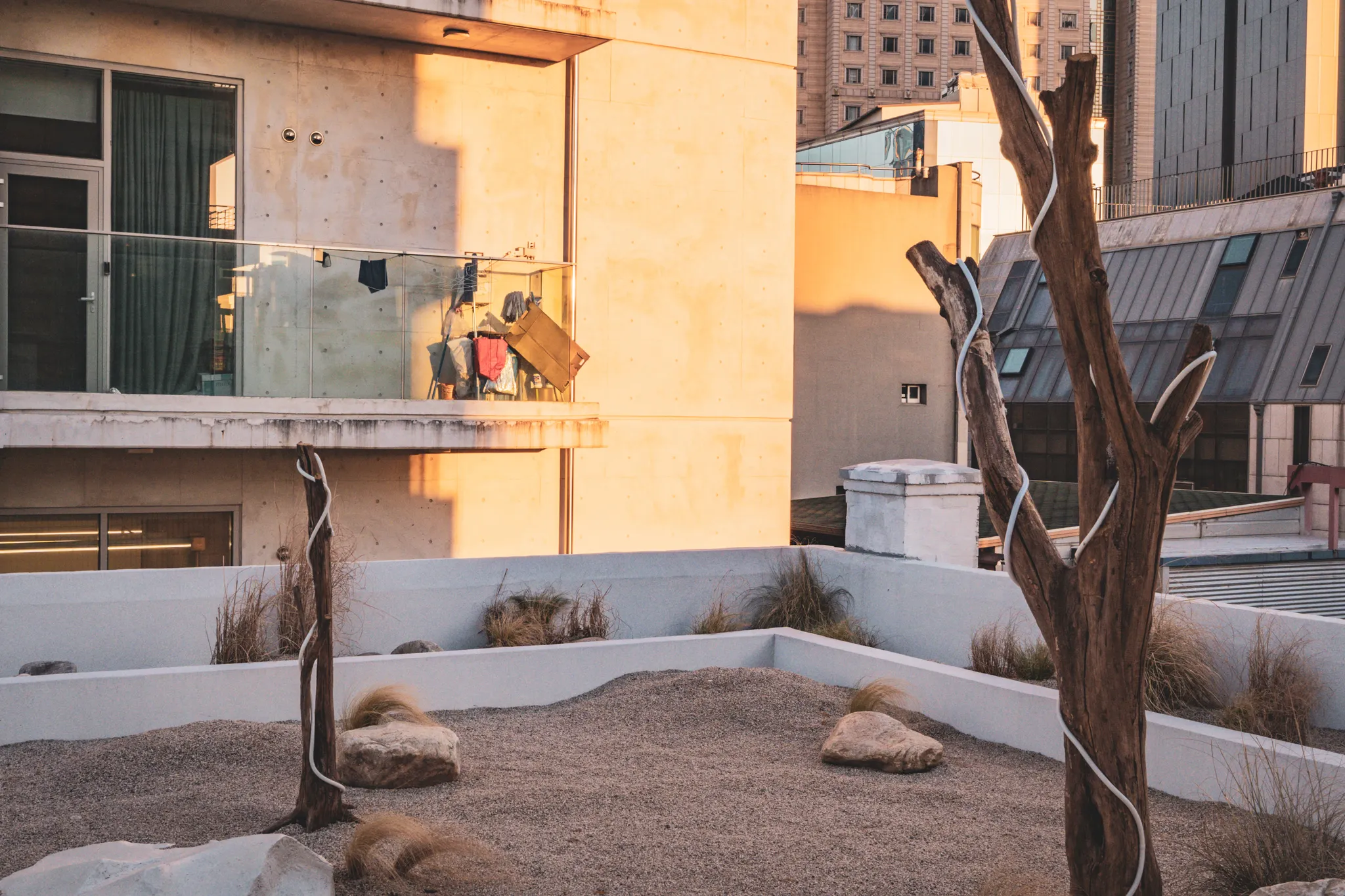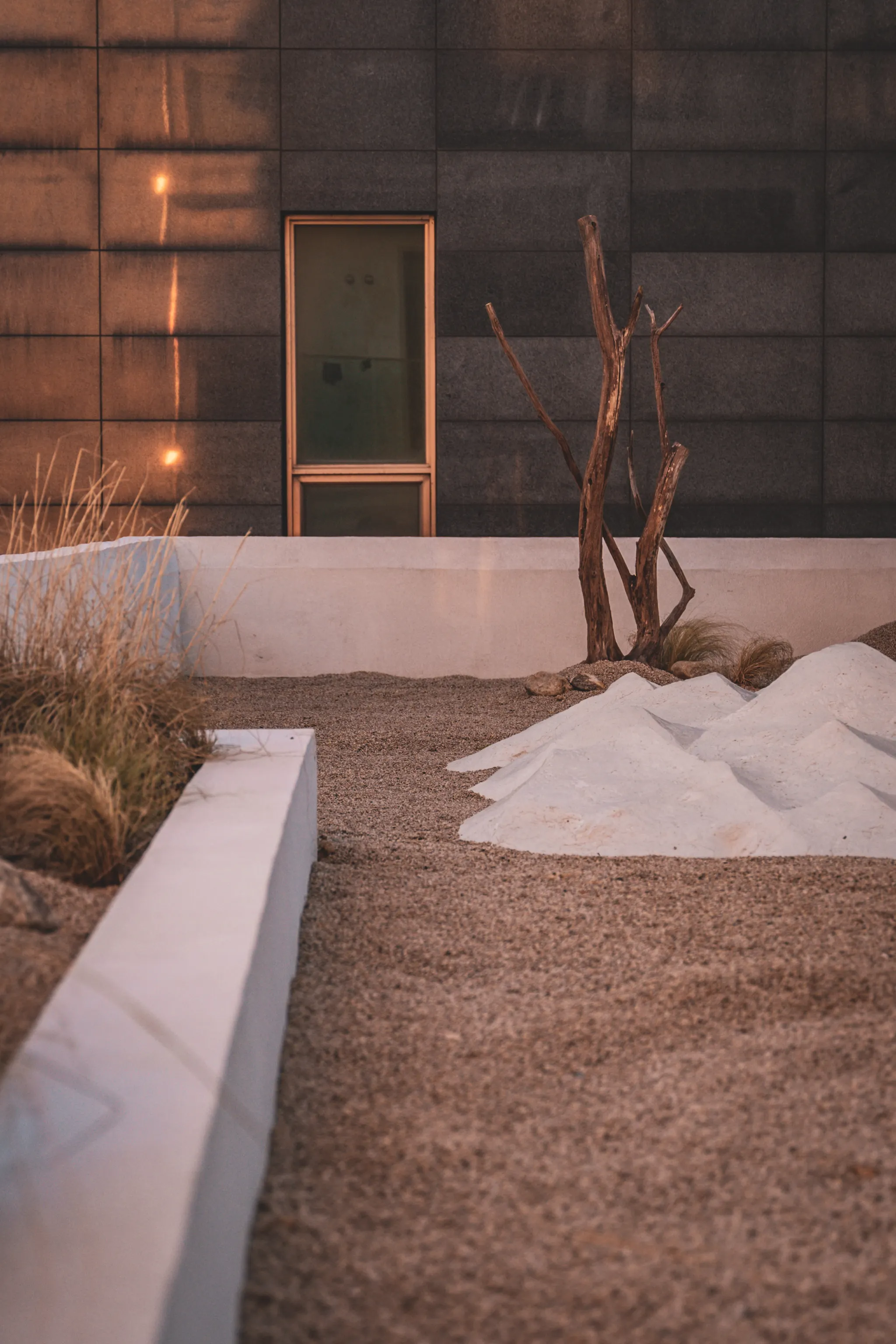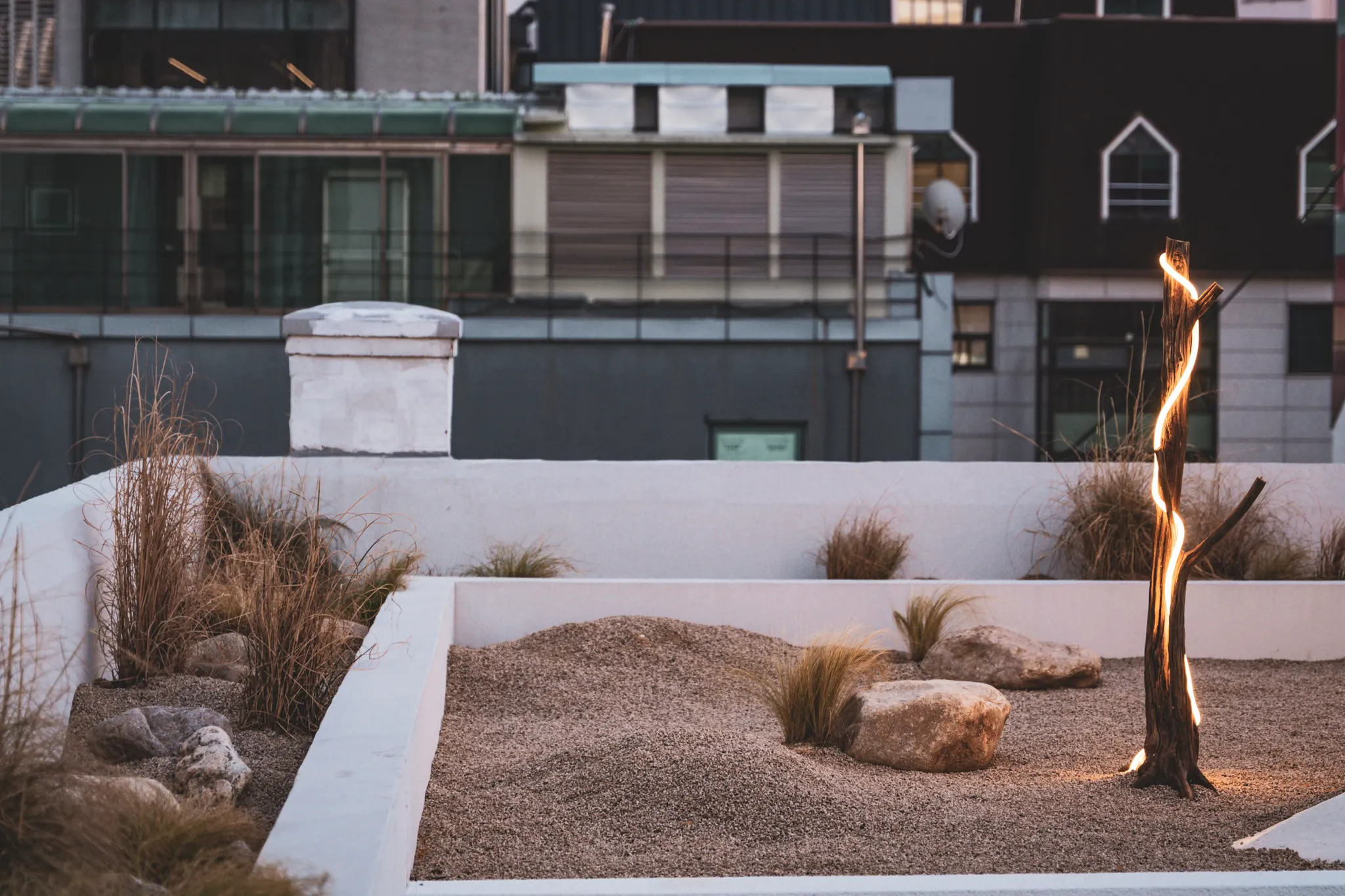 고목이 지나온 세월 만큼 선명한 생명력을 네온플렉스 조명으로 조명길을 만들어 표현하고, 그 주변은 모든 사물이 선명해지는 해질녘 노을빛을 떠올릴 수 있도록 드라이한 마감재. 마감재와 대비되는 어디에서도 볼 수 없었던 오브제틱한 화이트 스톤은 대지 사이에서 눈길을 사로잡습니다.