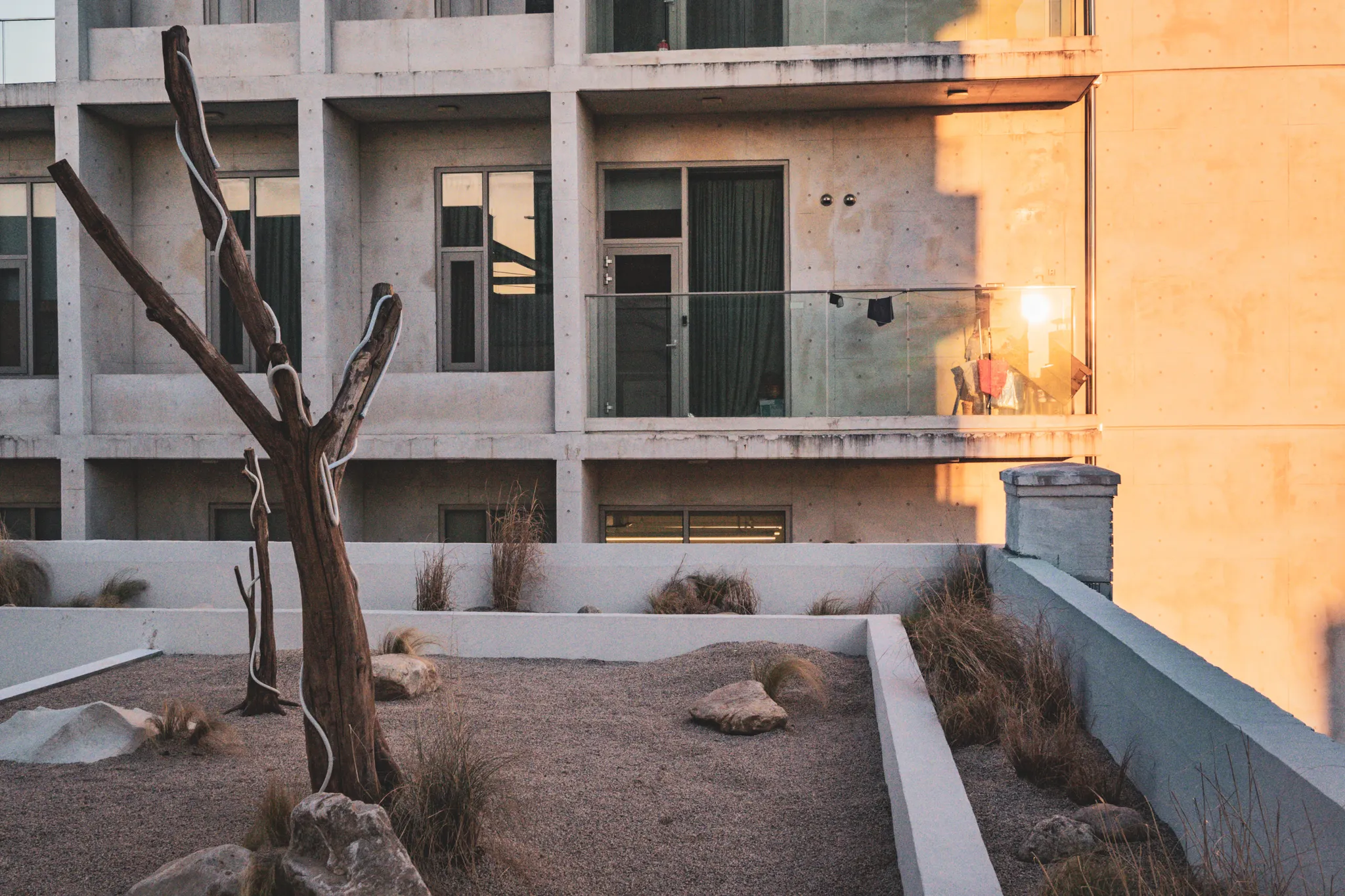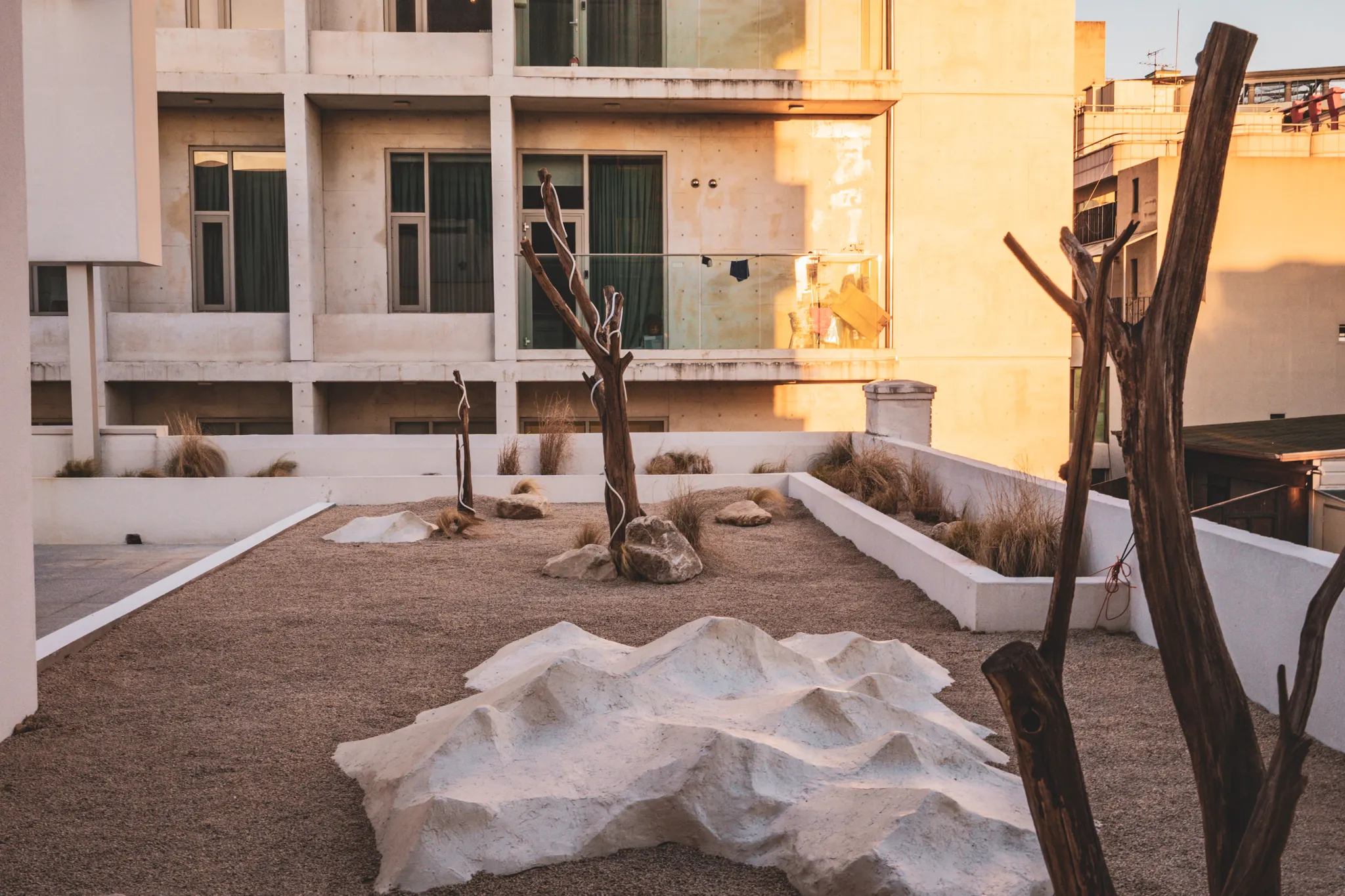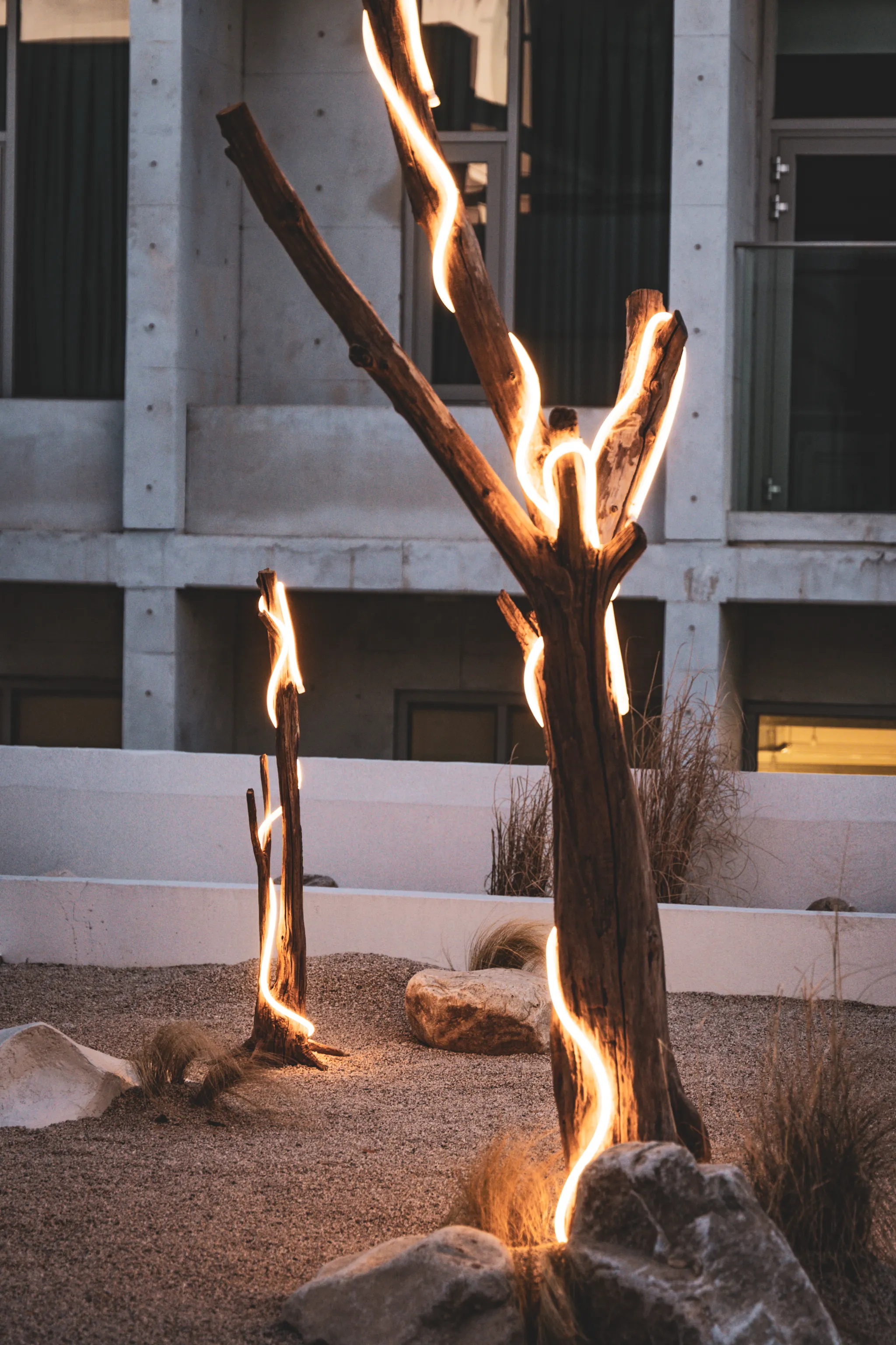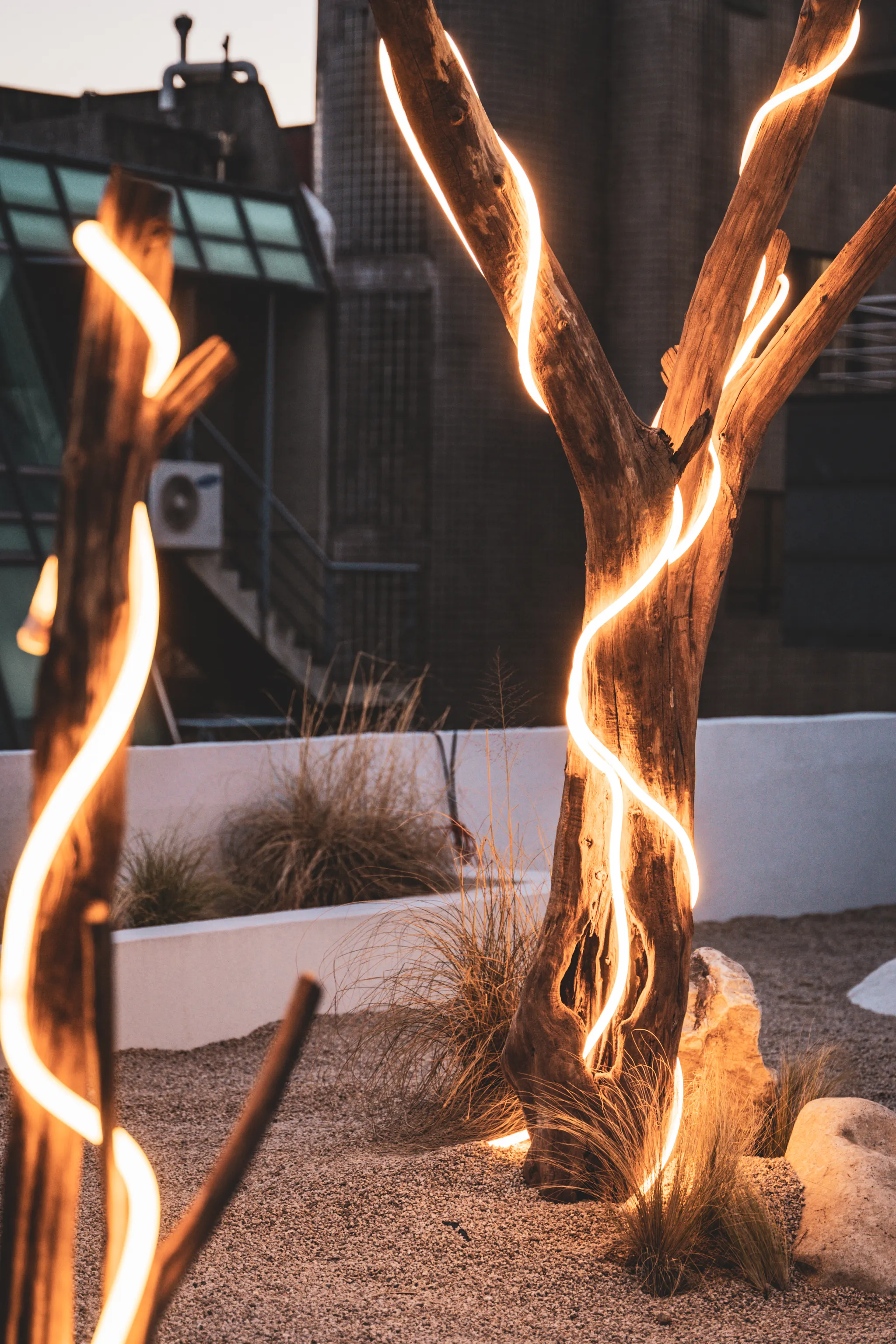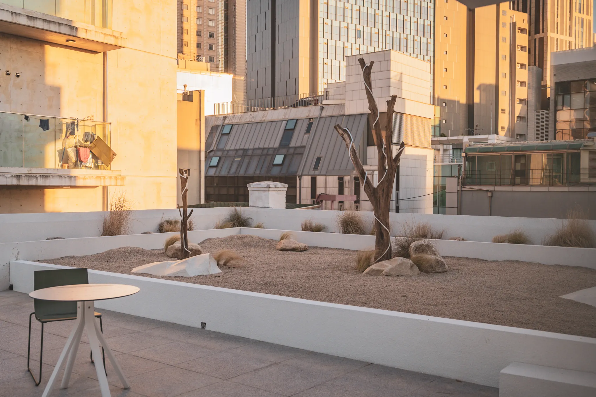 고목이 지나온 세월 만큼 선명한 생명력을 네온플렉스 조명으로 조명길을 만들어 표현하고, 그 주변은 모든 사물이 선명해지는 해질녘 노을빛을 떠올릴 수 있도록 드라이한 마감재. 마감재와 대비되는 어디에서도 볼 수 없었던 오브제틱한 화이트 스톤은 대지 사이에서 눈길을 사로잡습니다.