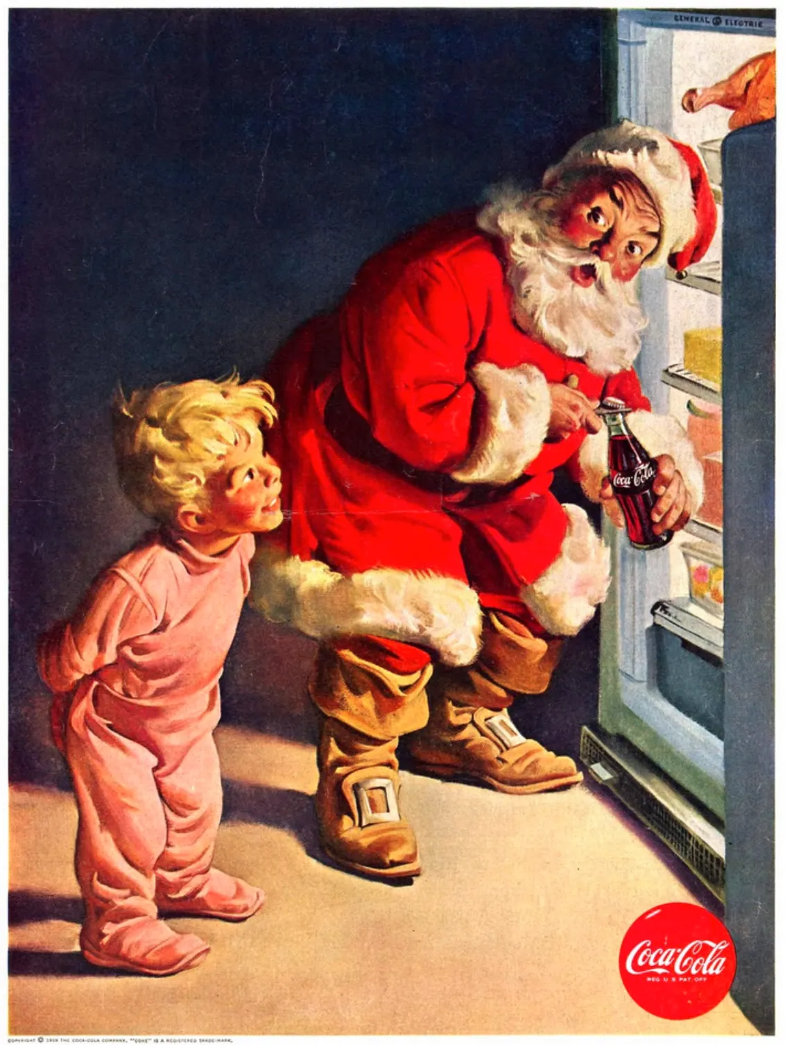 1931년 코카-콜라는 미국의 화가이자 광고 일러스트레이터였던 해든 선드블롬(Haddon Sundblom)에게 좀 더 현실적이면서 상징적이고 긍정적인 산타클로스를 그려달라고 의뢰합니다. 선드블롬은 앞서 언급한 클레멘트 클라크 무어(Clement Clarke Moore)의 <성 니콜라스 성자의 방문>에 들어간 삽화의 이미지에서 영감을 얻어 유쾌하고 따뜻하고 친근하면서도 약간은 통통한 산타클로스의 모습을 그려냈습니다.