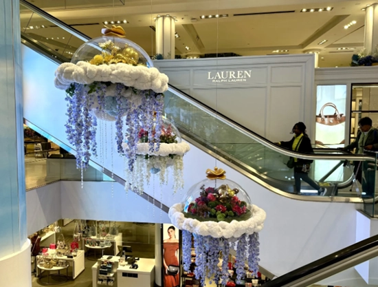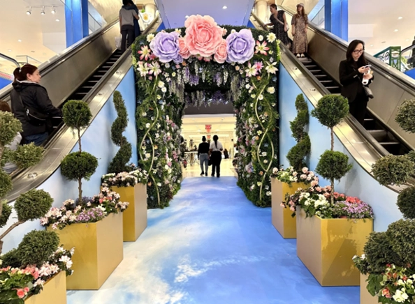 일반적으로 우리나라에서는 넓고 큰 공간을 전시 공간으로 삼고 그 전시를 보러 오도록 유도하지만, 메이시스 백화점은 플라워를 매개로 플라워 사이니지, 플라워 조형물, 플라워 VMD, 플라워 행잉 등 전체 공간, 전체 층을 플라워로 곳곳에 조성합니다.