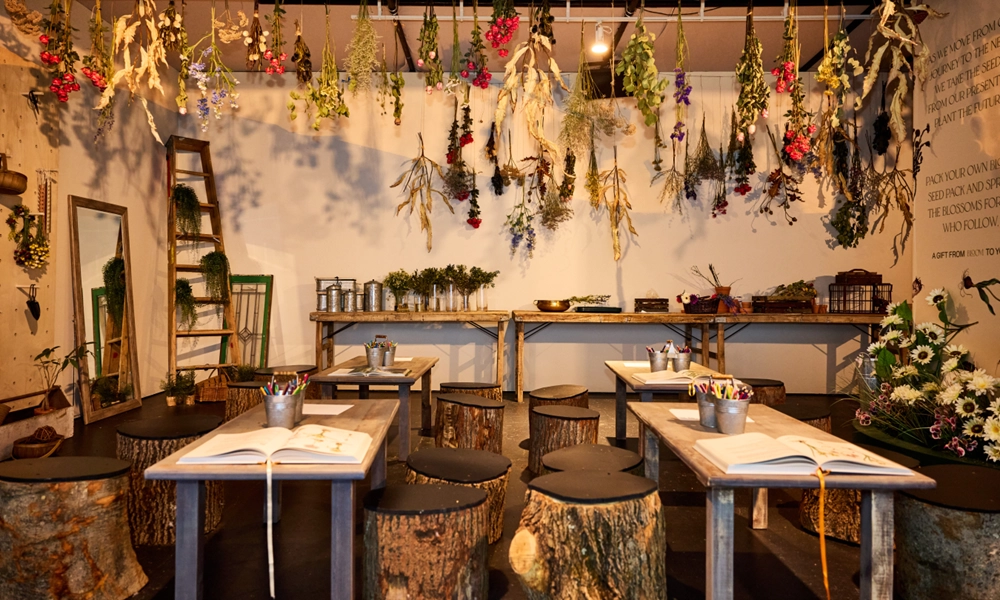 레베카 루이즈 로의 설치는 꽃을 공간에 두는 것이 아니라 시간의 흐름까지 공간 경험으로 확장합니다.