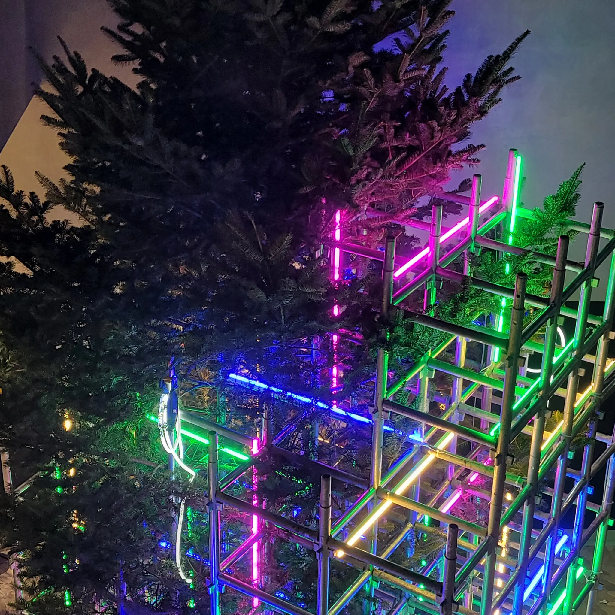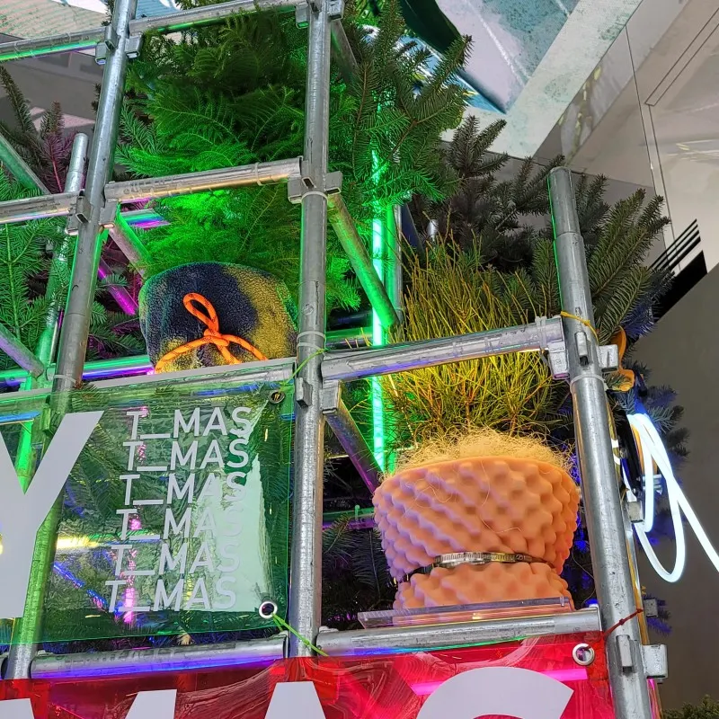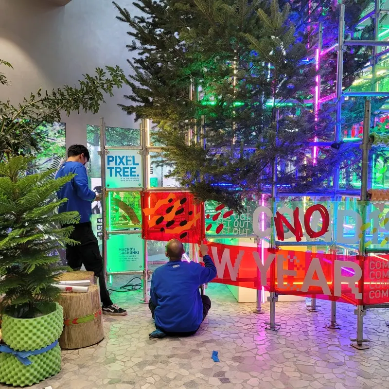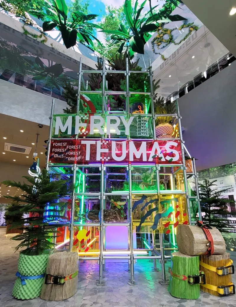 틈에 크리스마스 트리를 연출할때, 공간을 장식하는 주변 연출물은 재활용 스틸파이프를 대여하여 사용하였으며, 추후에 폐기하는 것 이 아닌, 대여 업체에게 파이프를 다시 반환하여 재사용이 가능하도록 작업을 진행 했어요!