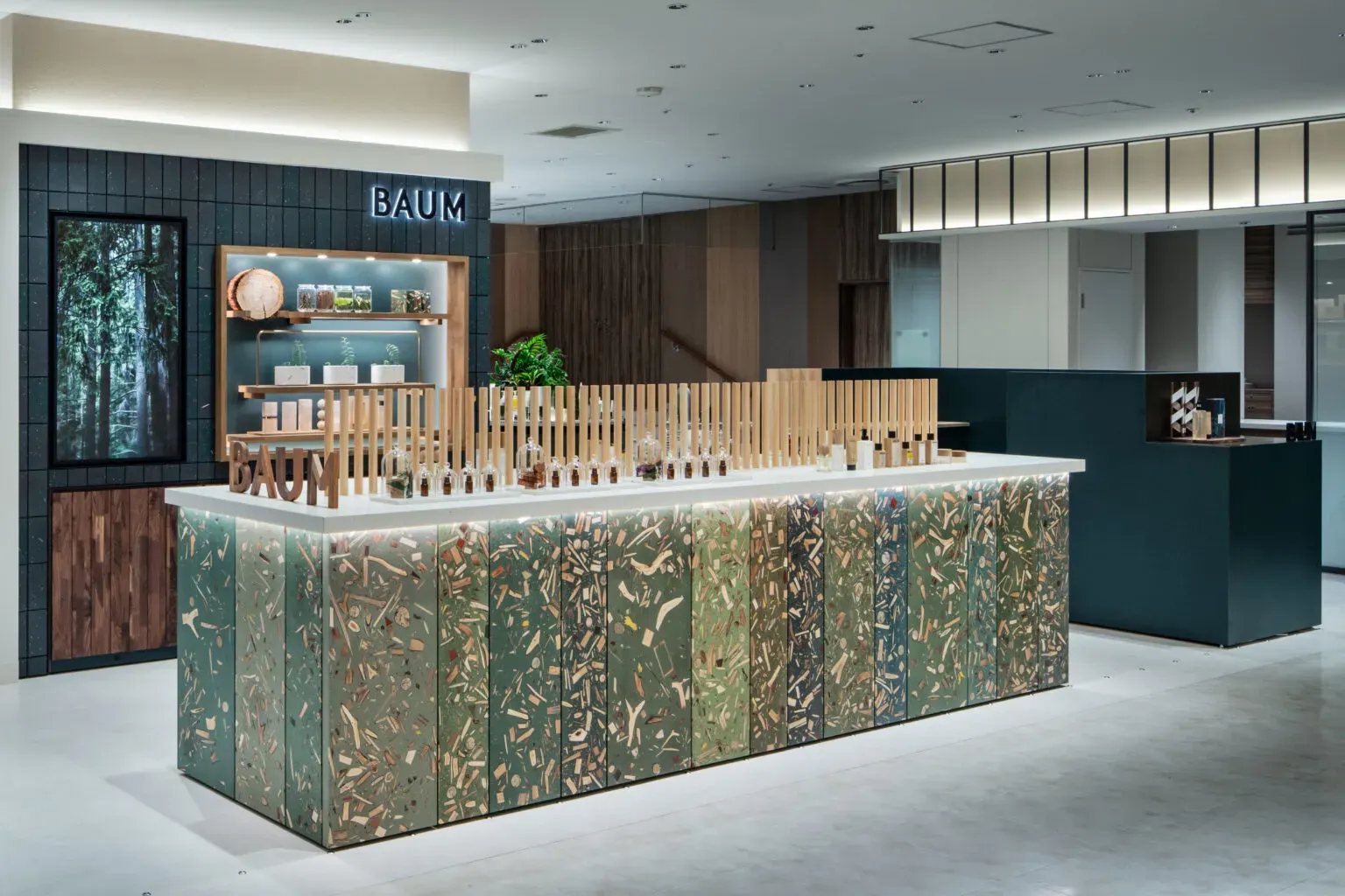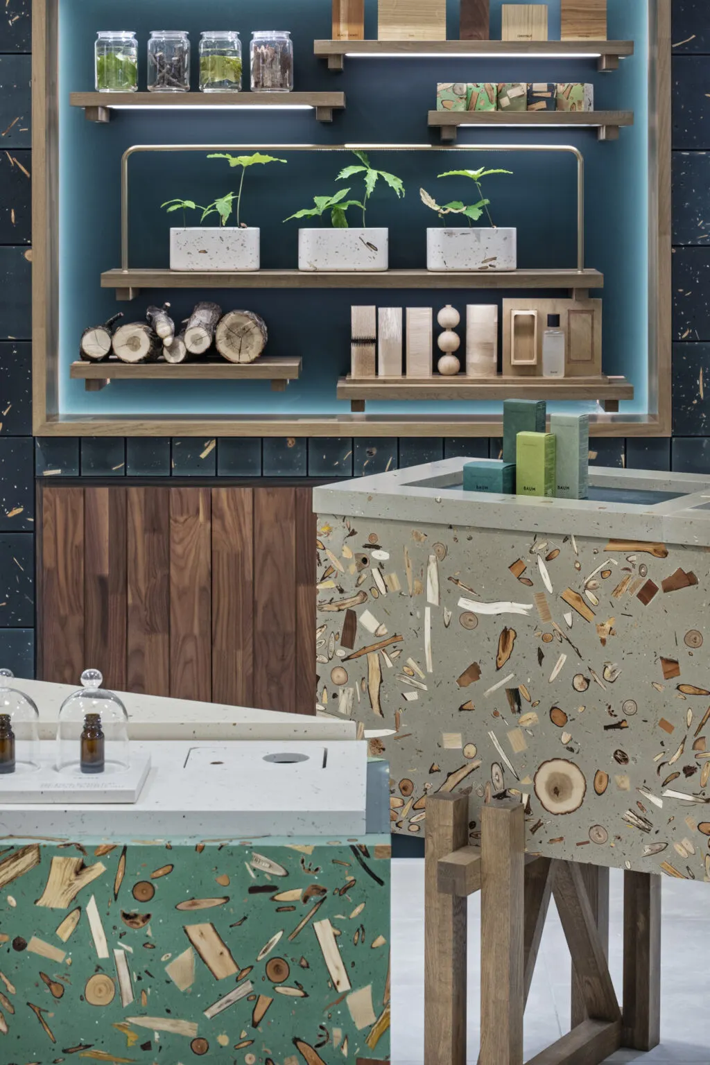 첫 번째로, 디자이너 Yuma Kano가 진행한 프로젝트입니다. 그는 목재 폐기물, 바크, 씨앗과 수성 레진을 활용해 새로운 소재의 테라조를 개발했습니다. 이 프로젝트는 폐기물을 활용하여 새로운 가치를 창출하는 과정에서 지속 가능성을 한층 높여 주었습니다. 기존의 자원을 재활용함으로써 환경에 미치는 영향을 최소화하는 동시에, 아름답고 실용적인 결과물을 만들어냈죠.