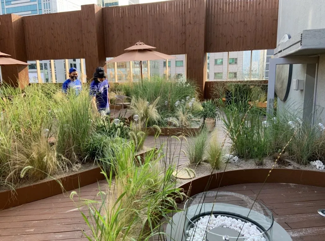 가을 계절이 지나 갈대가 지고 겨울을 맞이해가는 중 저녁의 옥상 조경을 담은 모습입니다.