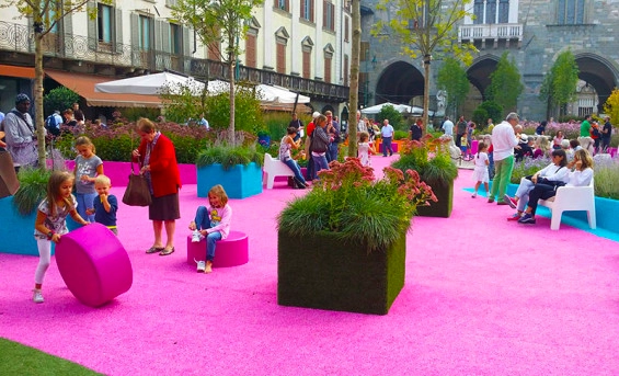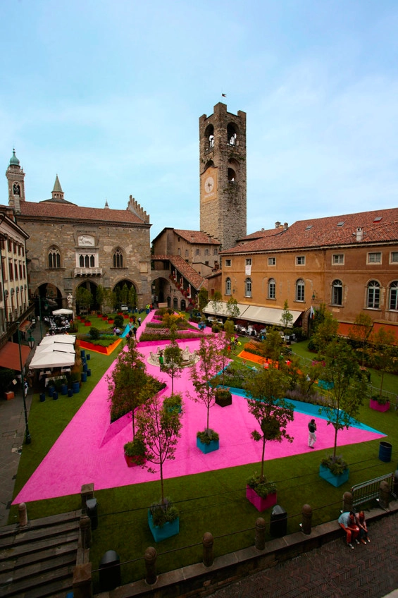 베르가모 이탈리아의 베키아 광장(Piazza Vecchia, Bergamo Italy)은 르네상스 시대의 광장으로 르 코르뷔지에가 “유럽에서 가장 아름다운 광장”이라고 부르던 곳입니다. 2014년 9월 베르가모에서 열린 주요 국제 경관 심포지엄 Arketipos이 열리는 기간에 이 광장은 일시적으로 “웰빙과 치유”라는 주제를 탐구하는 현대적 풍경으로 변신을 해야했습니다. 끊임없이 진화하는 도시 서사의 일부로서 옛것과 새것이 어우러진, 즉 역사적 건축물에서 새로운 성장과 긍정적인 변화의 의미를 담는 방법은 무엇이었을까요?