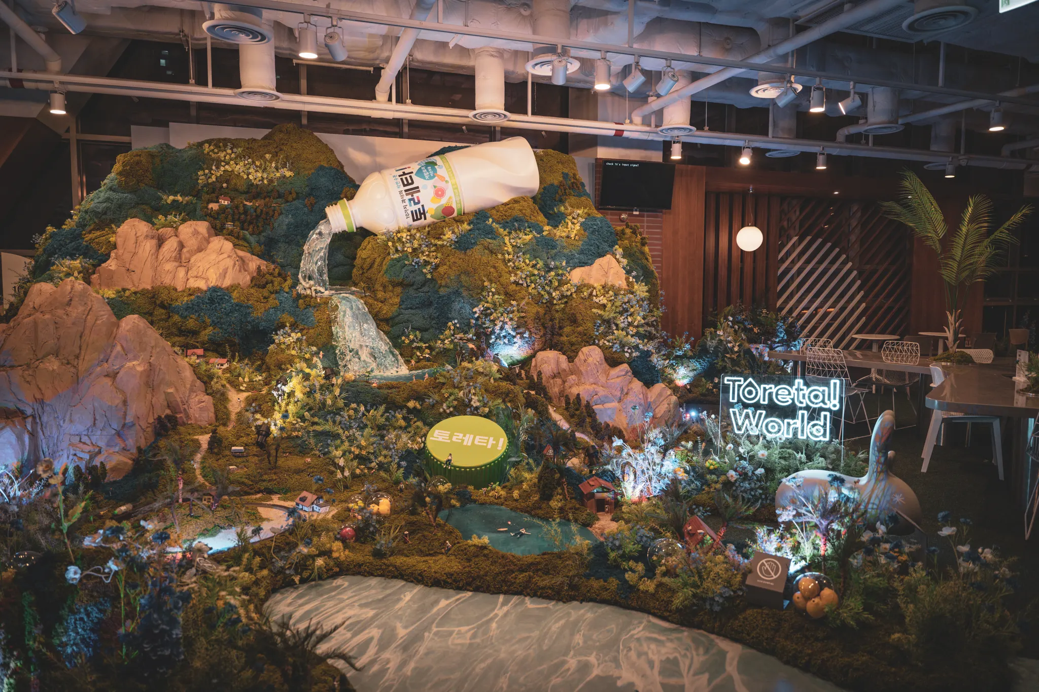 메마른 지구에 수분을 보충하기 위해, 코엑스 케이팝스퀘어에서 선보였던 토레타월드의 한 조각이 연남 CGV에 착륙했습니다. 폭포수처럼 쏟아지는 토레타로 인해 풍성하게 자라난 자연, 그리고 그 곳을 이루고 있는 작은 마을을 표현했습니다.
