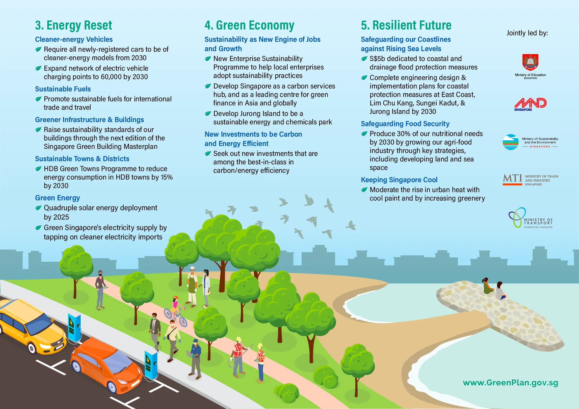 2021년 2월에 출범한 싱가포르 그린플랜 2030은 전 국가적 운동에 활력을 불어넣고, 무역산업부(MTI), 교통부(MOT), 국개개발부(MND), 교육부 등 5개 부처가 주도하고 전체 정부의 지원까지 받을 수 있습니다. 아래 다섯 가지의 큰 기둥을 기반으로 지속가능한 글로벌 도시를 만드는 것이 목표라고 합니다.