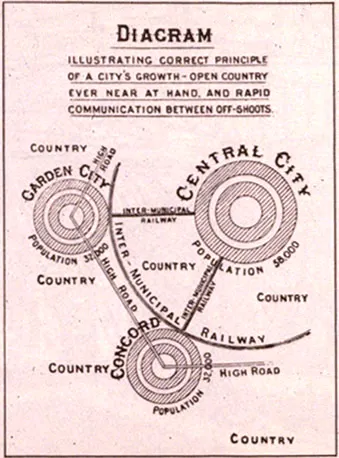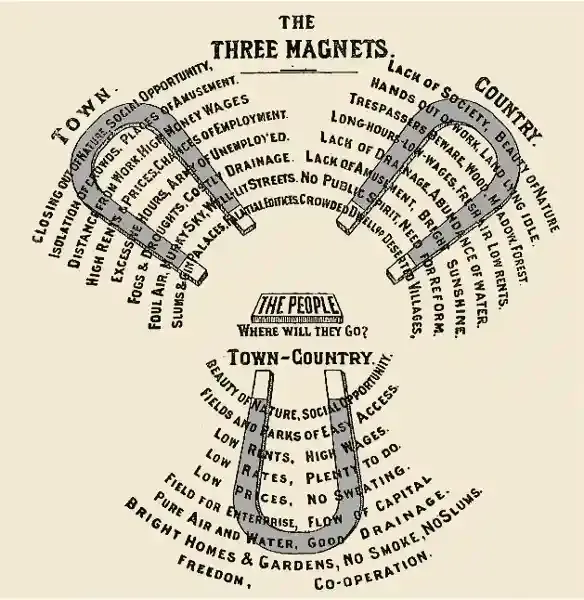 * 이미지: 에버니저 하워드의 세 자석 모양의 그림. 여기에는 '도시Town', '전원Country', '도시-전원Town-Country' 중에서 "사람들이 어디에 살 것인가?"를 묻고 있다.
