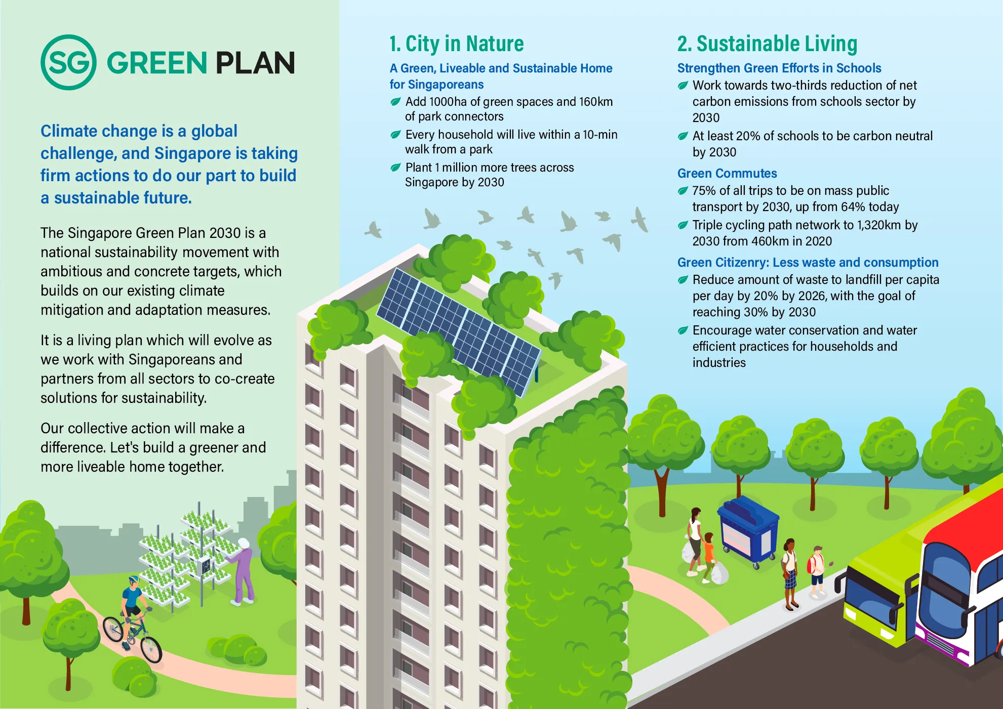 우리는 Singapore Green Plan 2030 이라는 10개년 계획을 세웠습니다. 녹색 계획은 우리 삶의 거의 모든 측면에 영향을 미치는 확고한 실행 계획을 포함하는 국가 전체의 지속 가능한 개발 의제입니다.