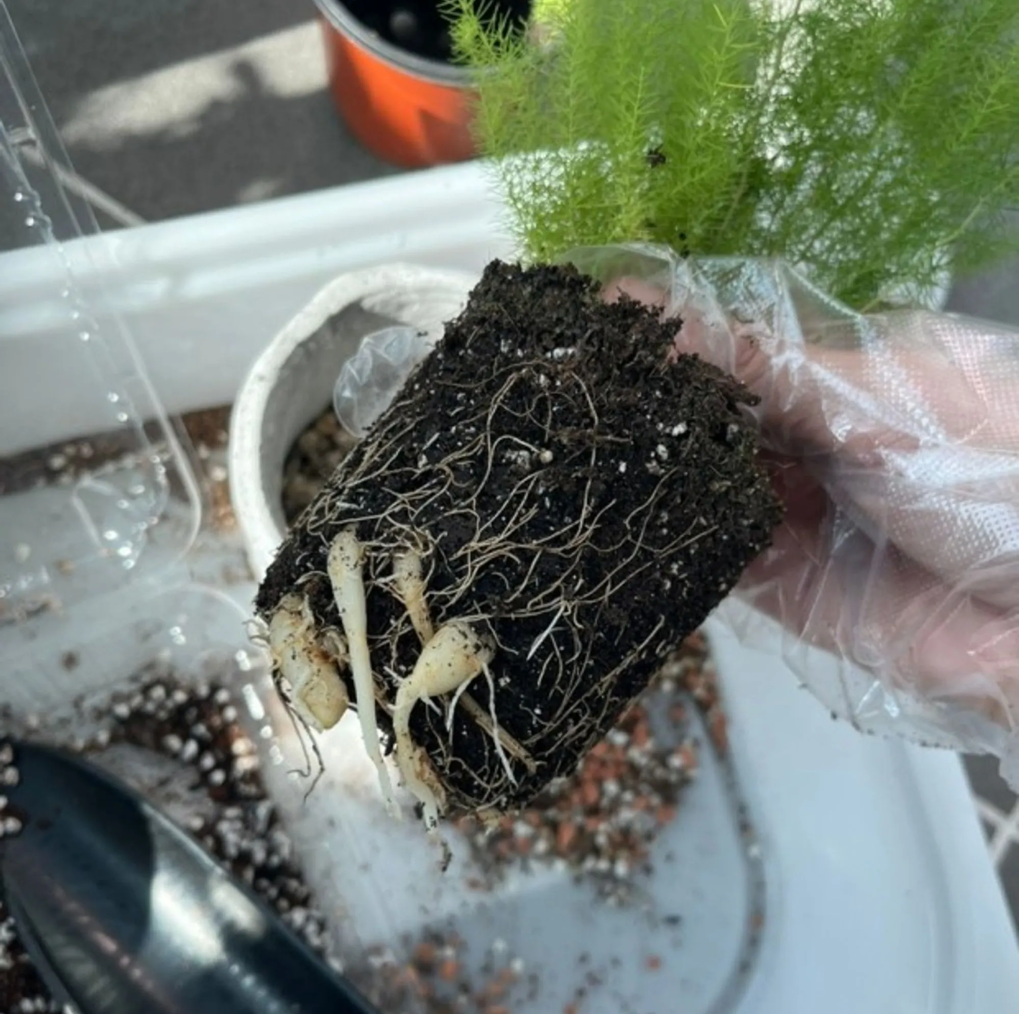 아스파라거스 메이리의 뿌리 입니다! 아스파라거스 종류의 대부분은 알뿌리를 가지고 있는데요. 분갈이할 때 몸살이나 하엽 방지를 위해 알뿌리를 손상시키지 않는 게 좋아요! 아스파라거스는 성장 속도도 빠른 편이라 넉넉한 크기의 화분에 심어주는 것도 좋은 방법이랍니다