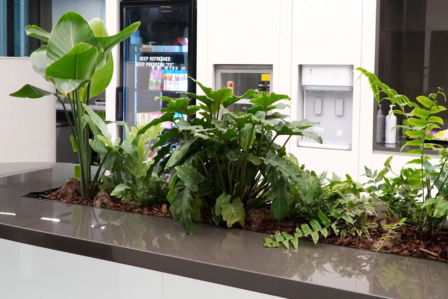 창문이 없어 다소 답답한 느낌이 있던 사무실에 식물을 배치해 시각적으로 밝아졌을 뿐만 아니라 공기정화의 효과까지 줄 수 있었습니다. 플랜트 박스가 파티션 역할을 하고 있어 기존의 철제 파티션보다는 훨씬 더 부드러운 분위기를 연출할 수 있습니다. 깔끔한 인테리어와 녹색 식물의 대비가 눈에 확 띄는 걸 볼 수 있죠!?