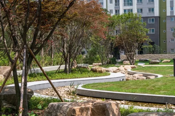 앞서 말씀 드렸듯이 법정 조경을 단순히 법적으로 제시한 조경 면적에 충족시키는 것에서 더 나아가 이제는 하나의 디자인으로 표현해내는 건설사들이 늘어나고 있습니다. 대표적으로 현대건설에서 진행한 사례를 보여드려볼까 하는데요
