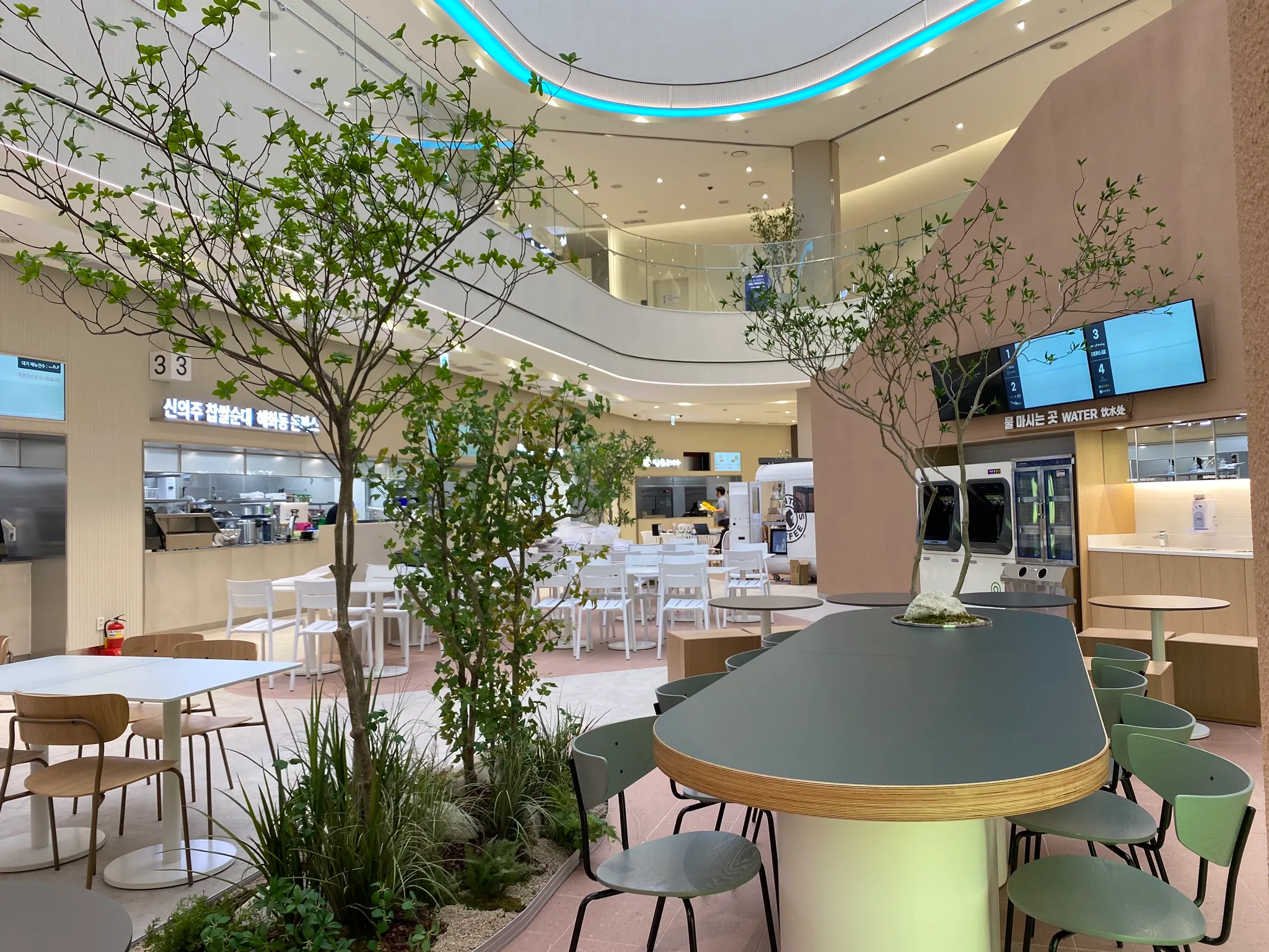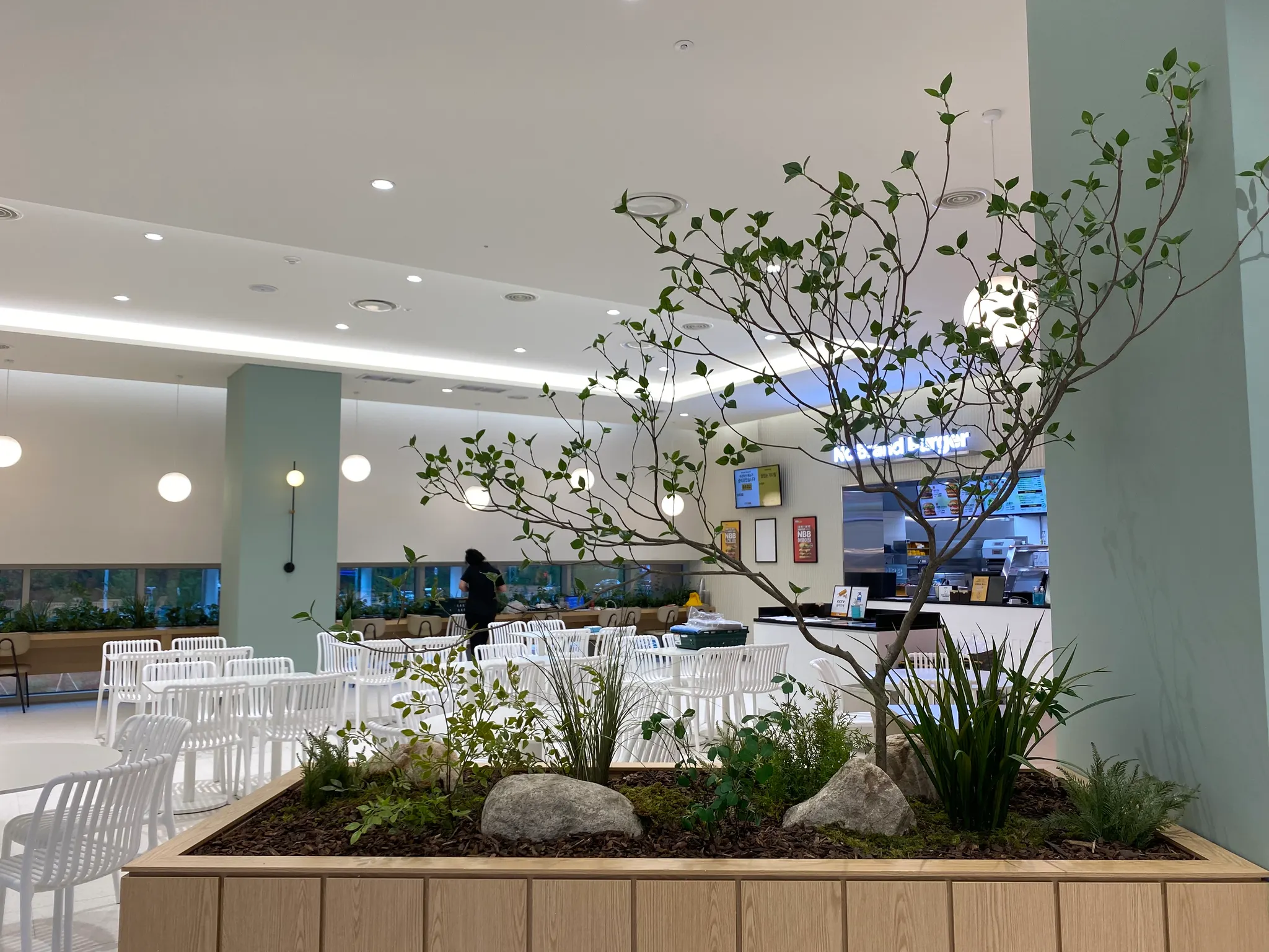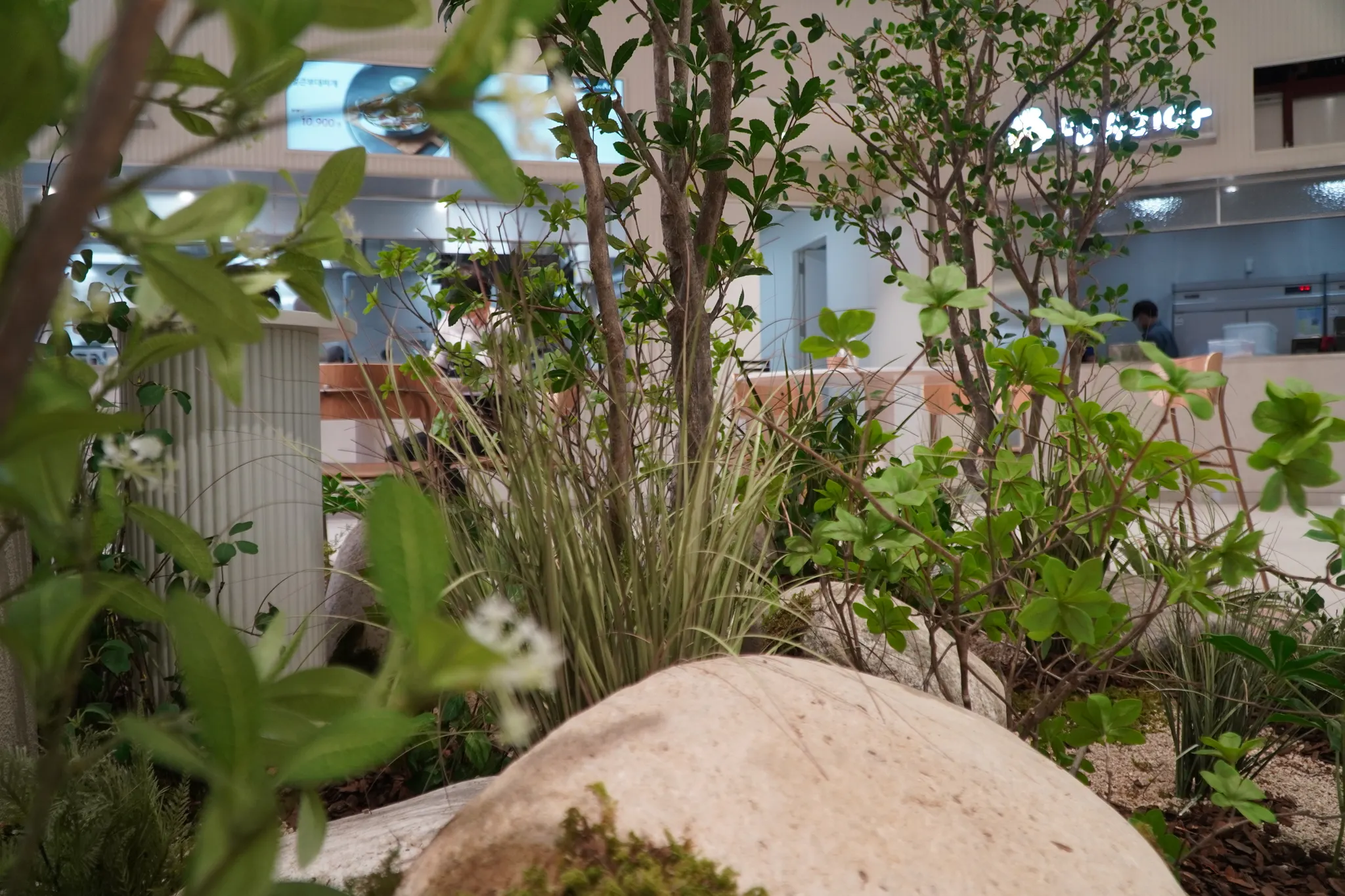 ‘잠시의 힐링’을 위해 오는 휴게소. 편안한 마음으로 몸과 마음을 녹이고 가시길 바라는 마음으로 그리너리 플랜테리어로 연출했습니다. 휴게소에서도 울창한 숲의 일부를 느낄 수 있도록, 실제 나무를 건조해 조화 잎을 붙여 만든 대형 나무를 공간 중간중간에 식재했습니다.