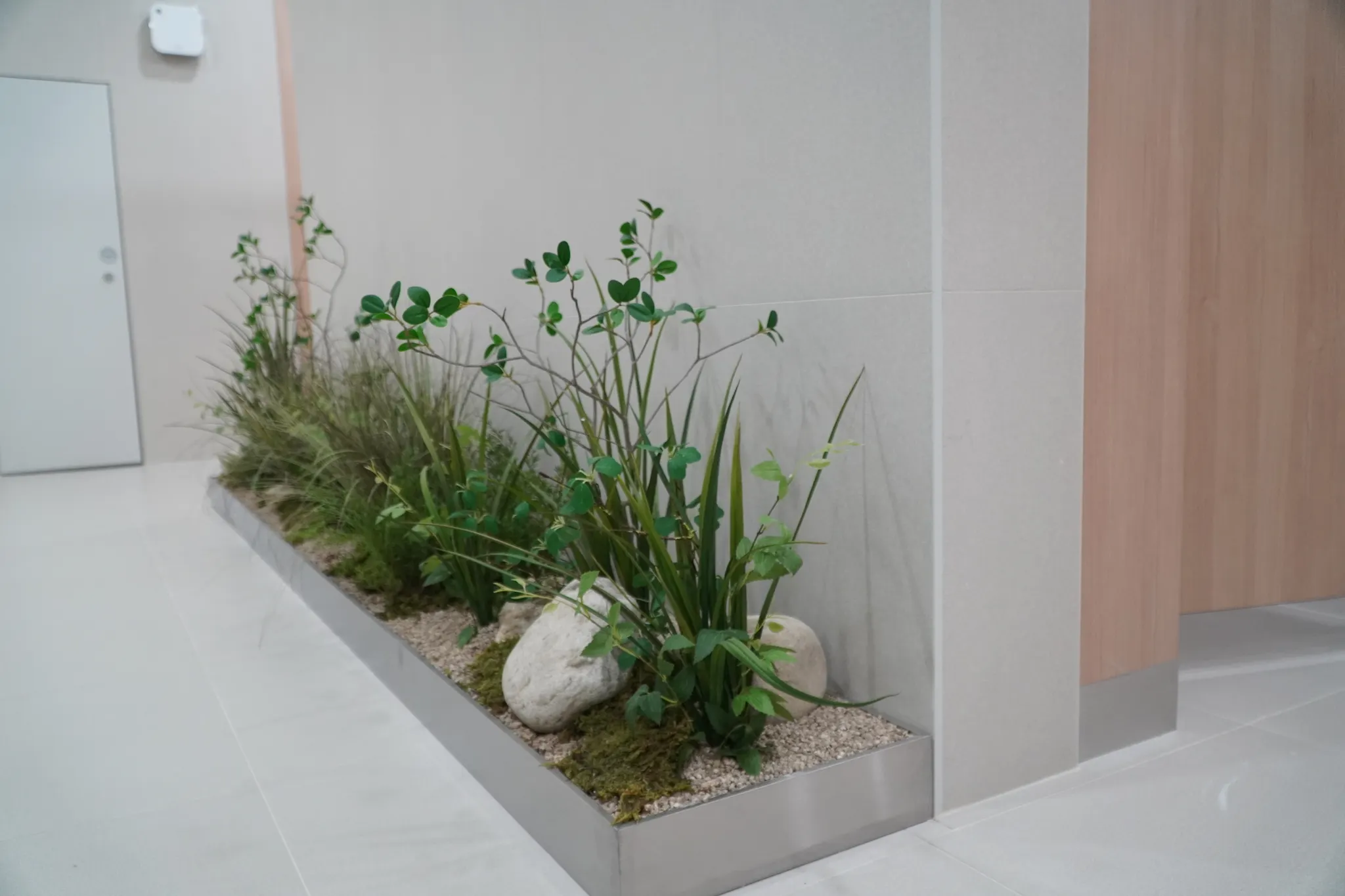 장소가 휴게소인 만큼, 화장실 연출에도 신경써, ‘힐링과 숲’ 컨셉에 완성도를 더했습니다. 두께감 있는 관엽과 하부 관엽, 스톤 등을 이용해 공간을 디자인했습니다.