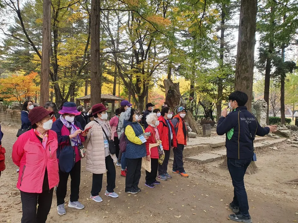 남이섬 도슨트를 듣고 계신 단체 관광객들 (출처 : 어뮤즈 트레블)