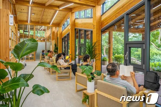 오동숲속도서관에 넓은 창 앞에 마련된 독서공간에서 책을 읽고 있는 사람들(출처 : 뉴스1)