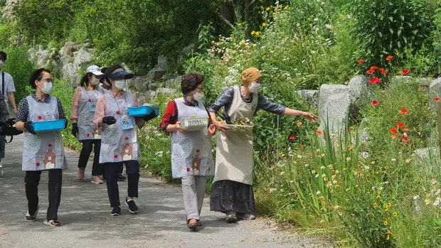 화순 ‘허브뜨락’은 1만 3000평 규모의 정원에 20년 간 가꾼 꽃과 허브가 가득하다. 허브를 따고 있는 체험 여행객들.(출처 : 광주일보)