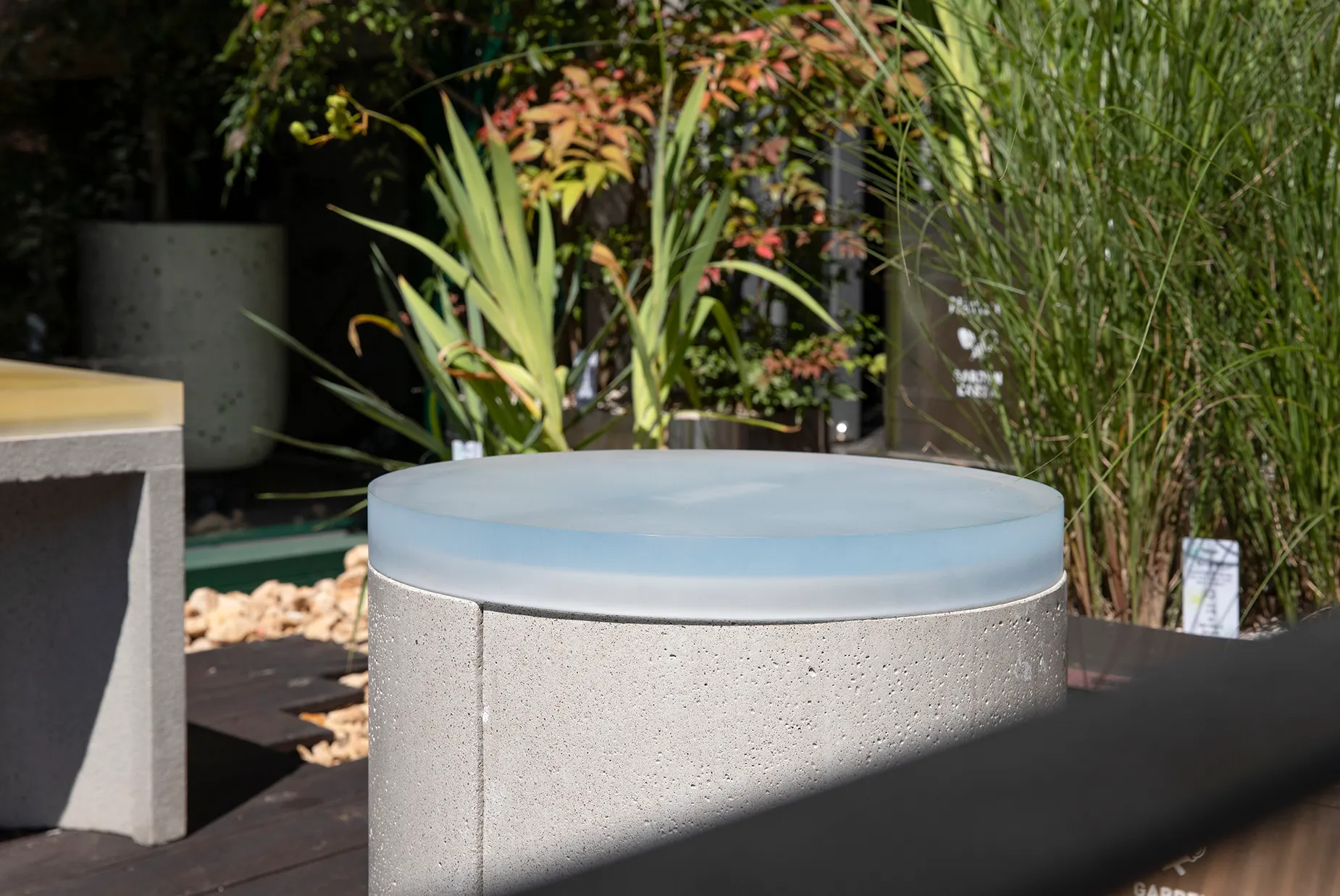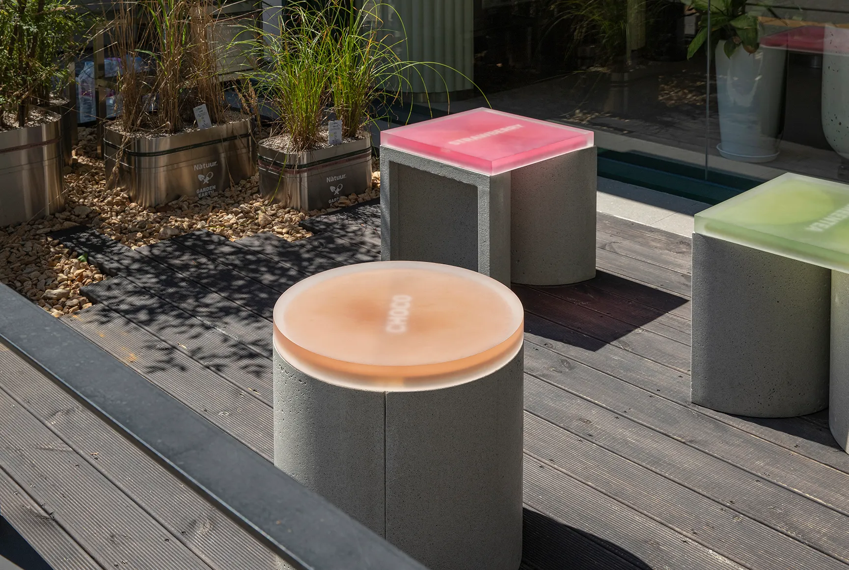 stool: 넓지 않은 공간에서 방문객이 가볍게 머무르다 갈 수 있도록 컴팩트한 사이즈의 스툴을 비치하였습니다. 모듈 콘크리트 소재의 스툴 위, 아크릴 상판을 올려 심플하면서도 팝한 무드를 연출하였습니다.