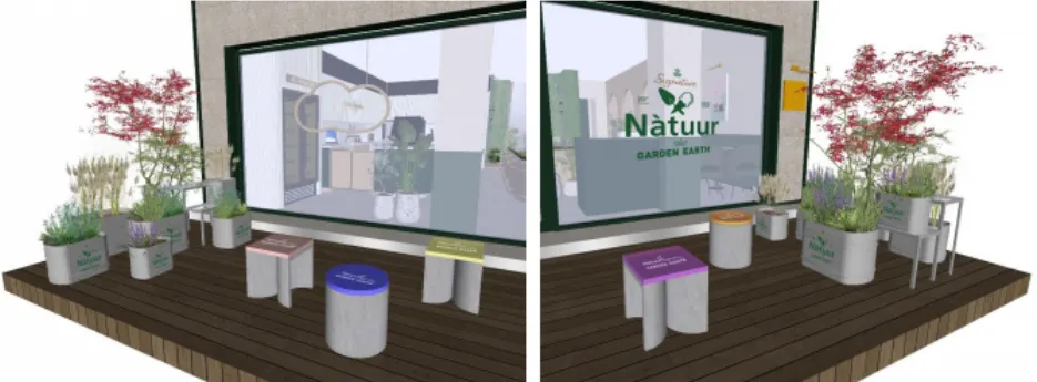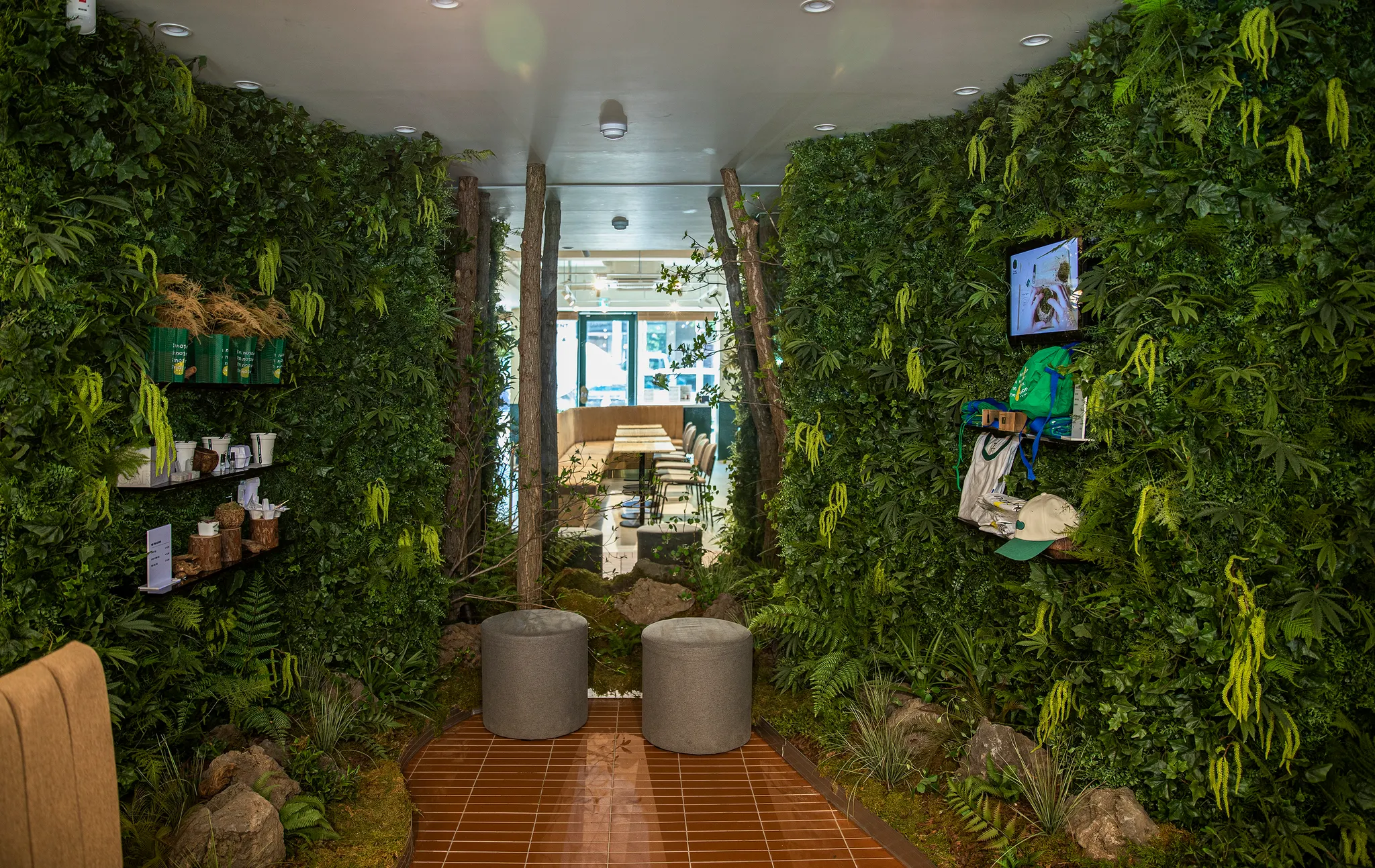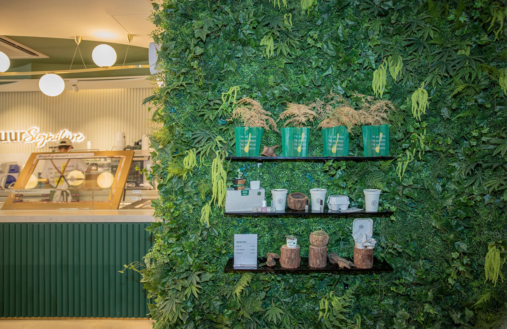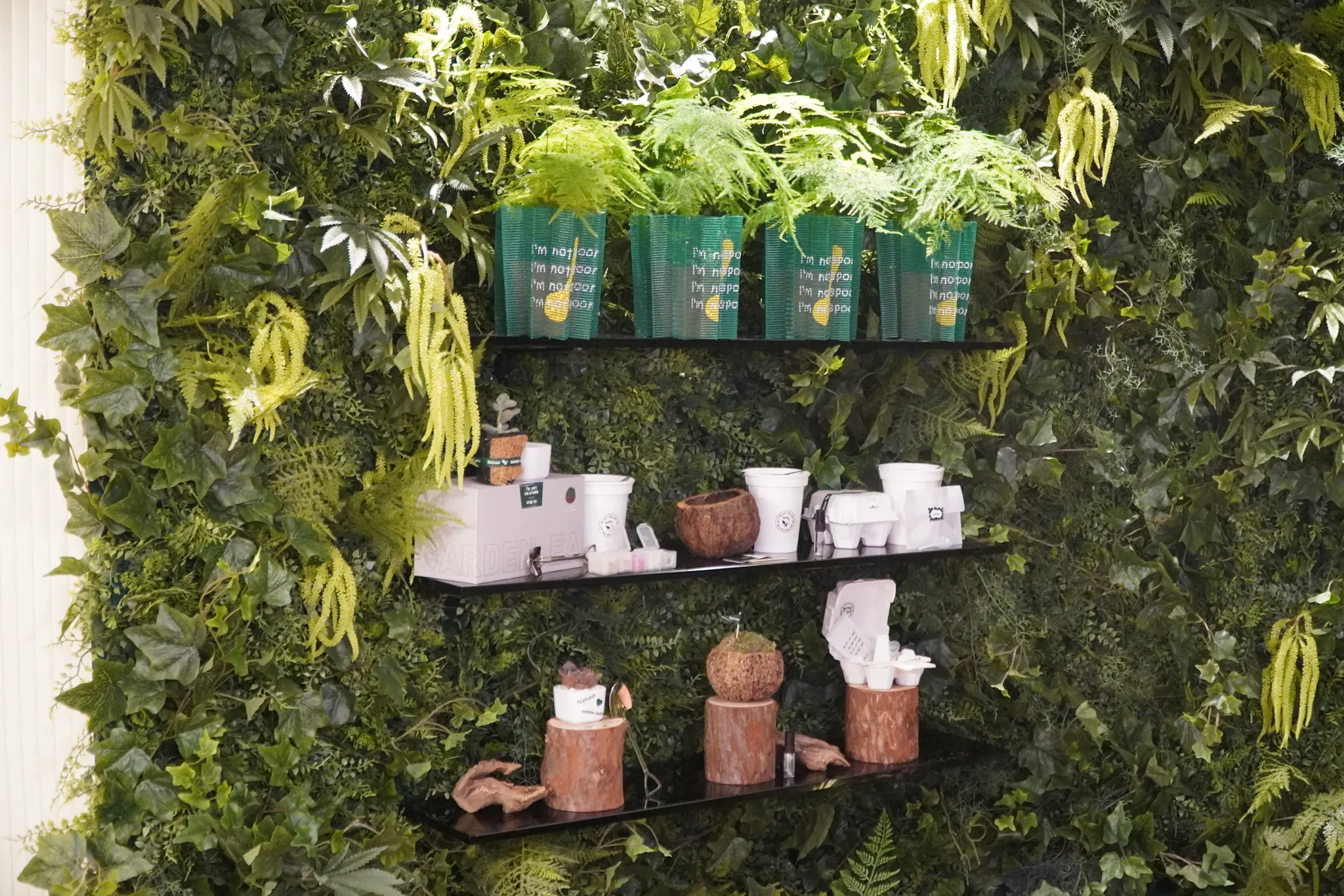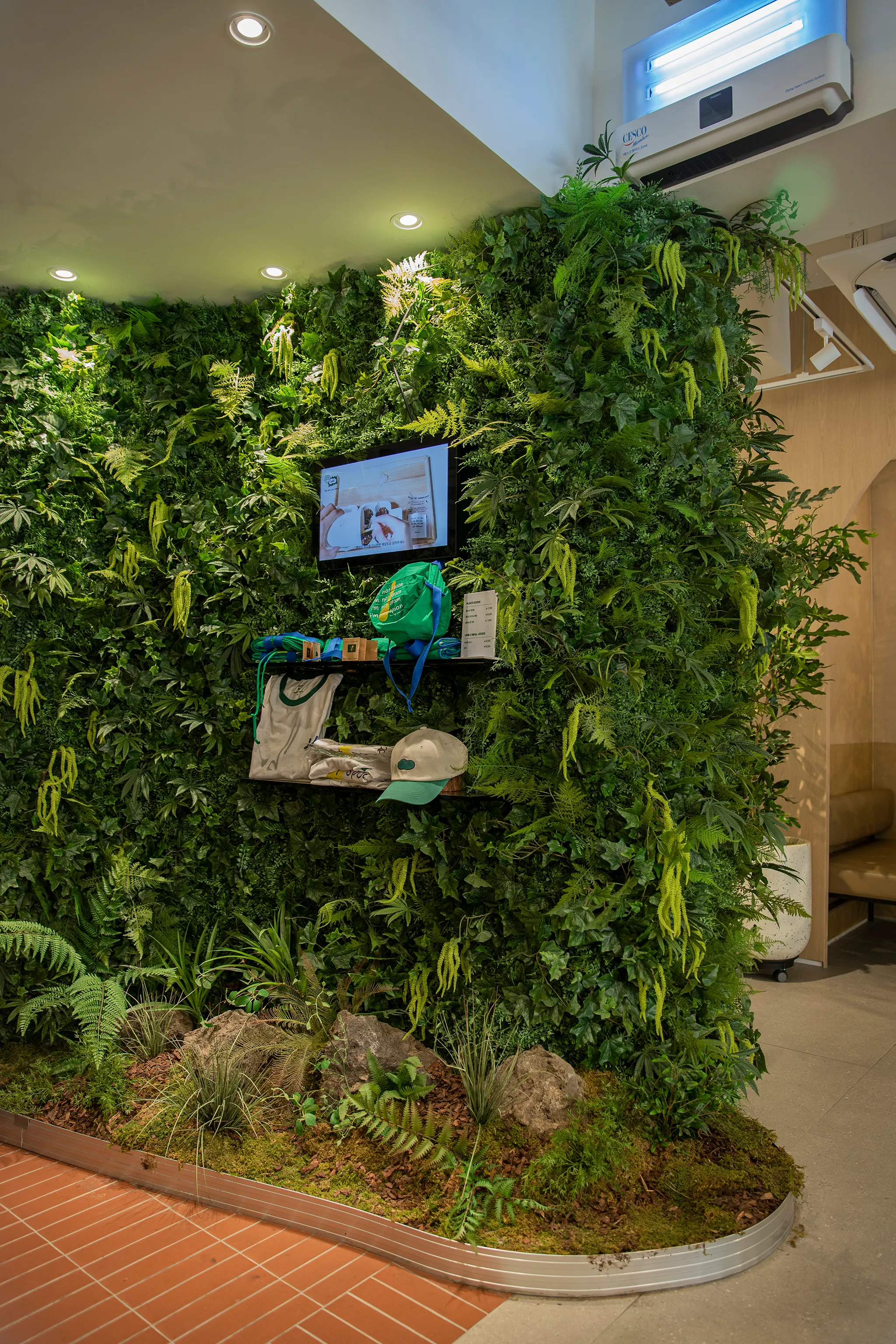 plants: 친환경 브랜드 이미지와 더불어 자연의 싱그러운 느낌을 연출하기 위해 비교적 관리가 쉬운 생화 수정을 활용합니다. 식재 화분 주변에는 스톤 플레이로 자연스러운 느낌을 연출하며, 화분은 폐유리로 만든 테라조 화분을 사용합니다.