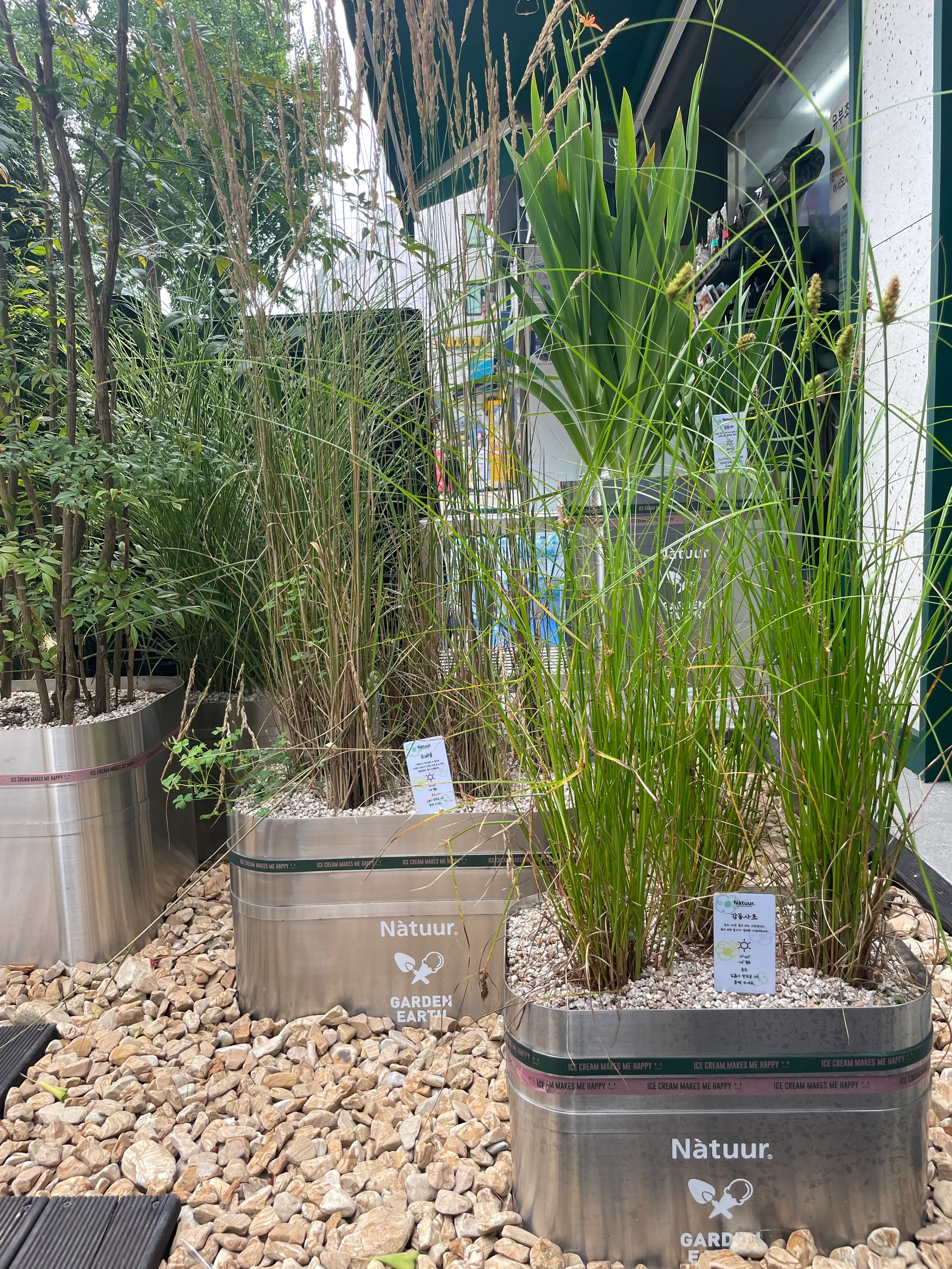 plants box: 해외 베지터블 가든을 모티브로, 다양한 철제 플랜트박스를 레이어드하여 자연스러운 차폐 식재를 하였습니다. 나뚜루 시그니처의 로고를 삽입, 홍보마케팅 효과를 극대화 하였습니다.