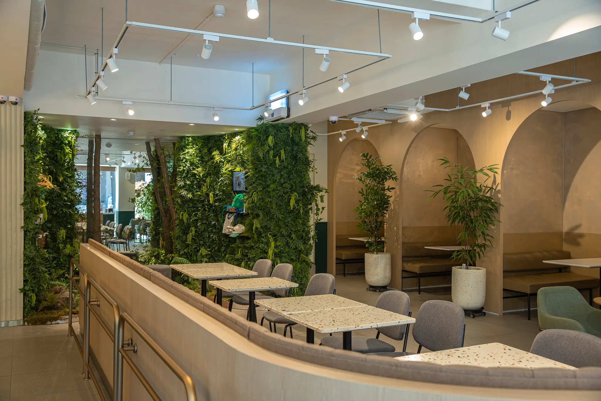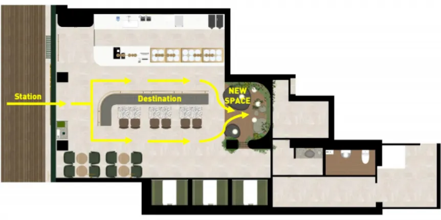 목적지는 우리가 원하는 목표와도 같은 공간입니다. 나뚜루 시그니처 매장을 ‘DESTINATION’으로, 나뚜루 고객들의 원래 목적인 구매가 이루어지는 곳임을 직관적으로 나타냅니다. 폐유리를 활용한 테라조 화분을 곳곳에 배치하여 <Greens Come True> 슬로건과 함께 친환경 경영을 선언한 나뚜루의 브랜드 정체성을 부각시킵니다.