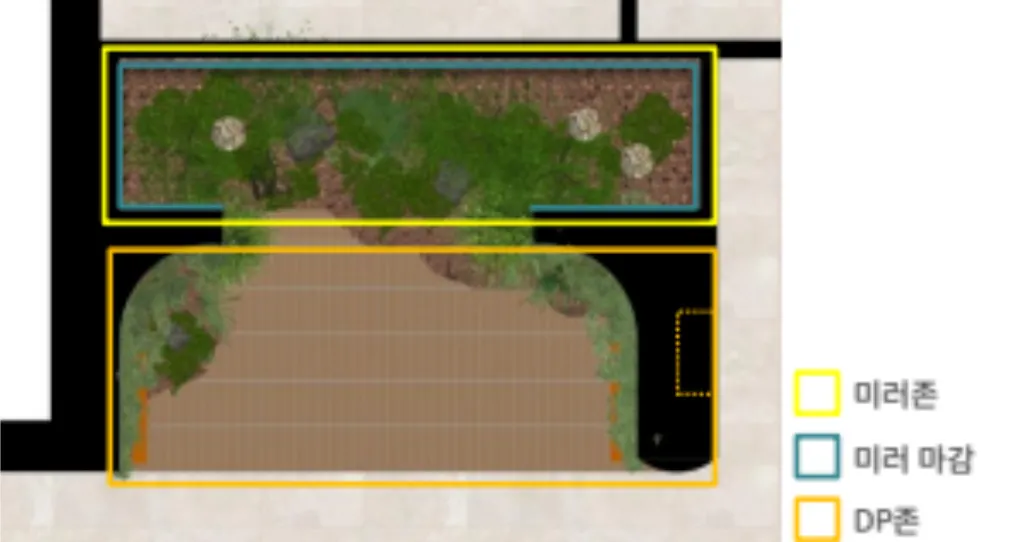 MIRROR: 안쪽 미러존에는 더 높은 위를 상상하게 하는 나무 기둥과 더불어 제작나무, 하부 식물 및 이끼와 스톤으로 자연스러운 숲을 연출하며 안쪽 공간 벽 전체를 미러로 마감하여 공간이 더 넓어보이는 효과를 줍니다.