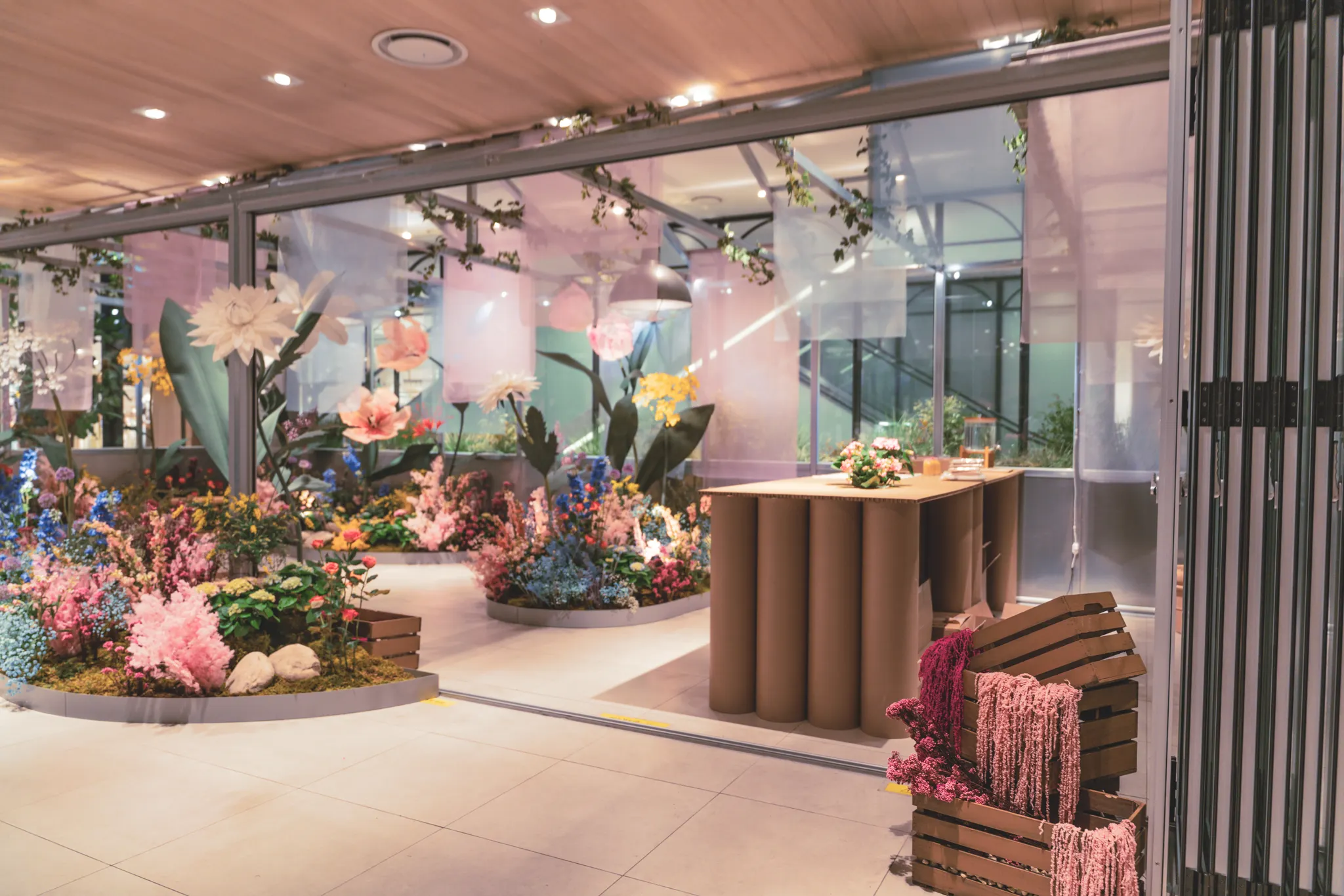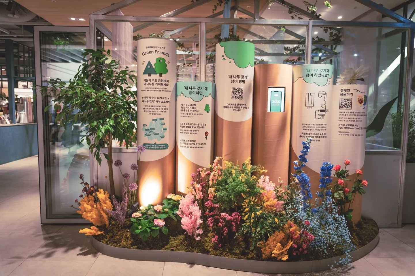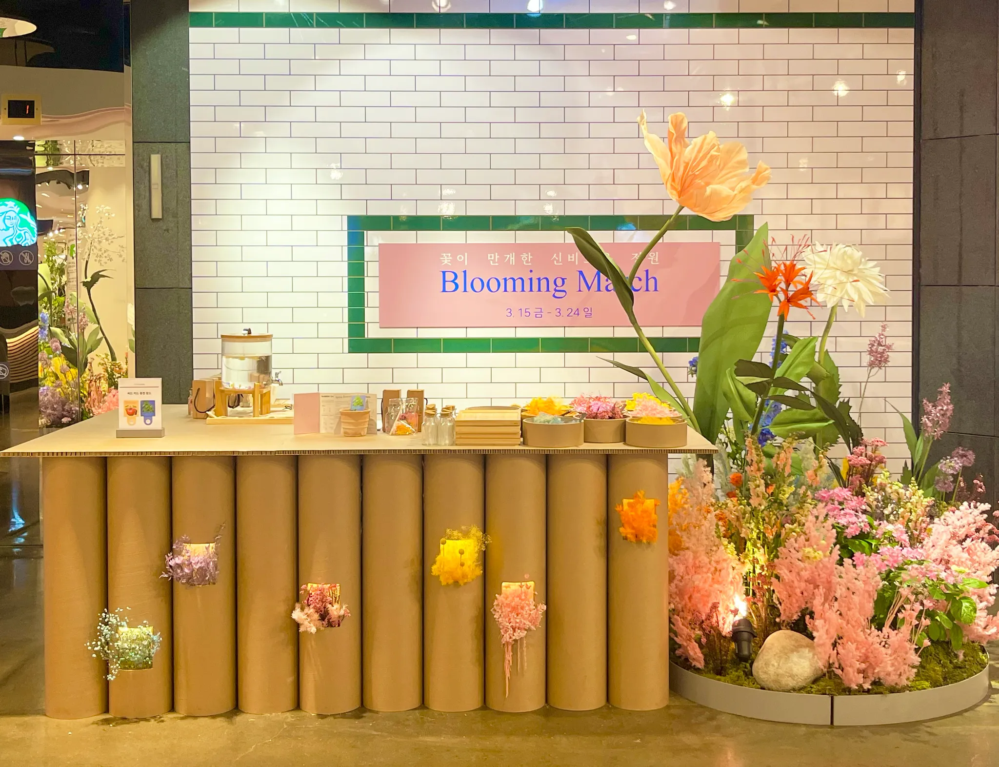 현대백화점에서 진행한 ESG 프로모션 취지 맞게 테이블과 전시 POP는 새활용이 가능한 종이 지관으로, 자이언트 플라워 이외에 플랜트 박스 모두 새활용이 가능하게 진행했습니다.