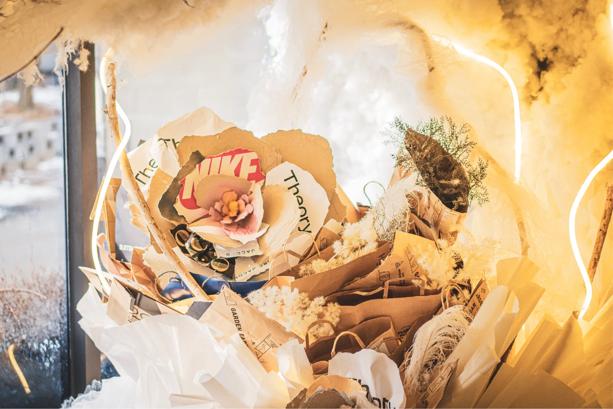 종이를 활용한 재순환은 마초의사춘기가 오래전부터 실천해 온 방법입니다. 종이 순환을 통해 자연의 순리와 순환을 표현한 전시물을 연출함으로써 종이에 새로운 가치를 더한 작품을 완성했습니다. 순환을 주요 키워드로 잡아 종이를 활용한 새로운 연출을 제안했죠.