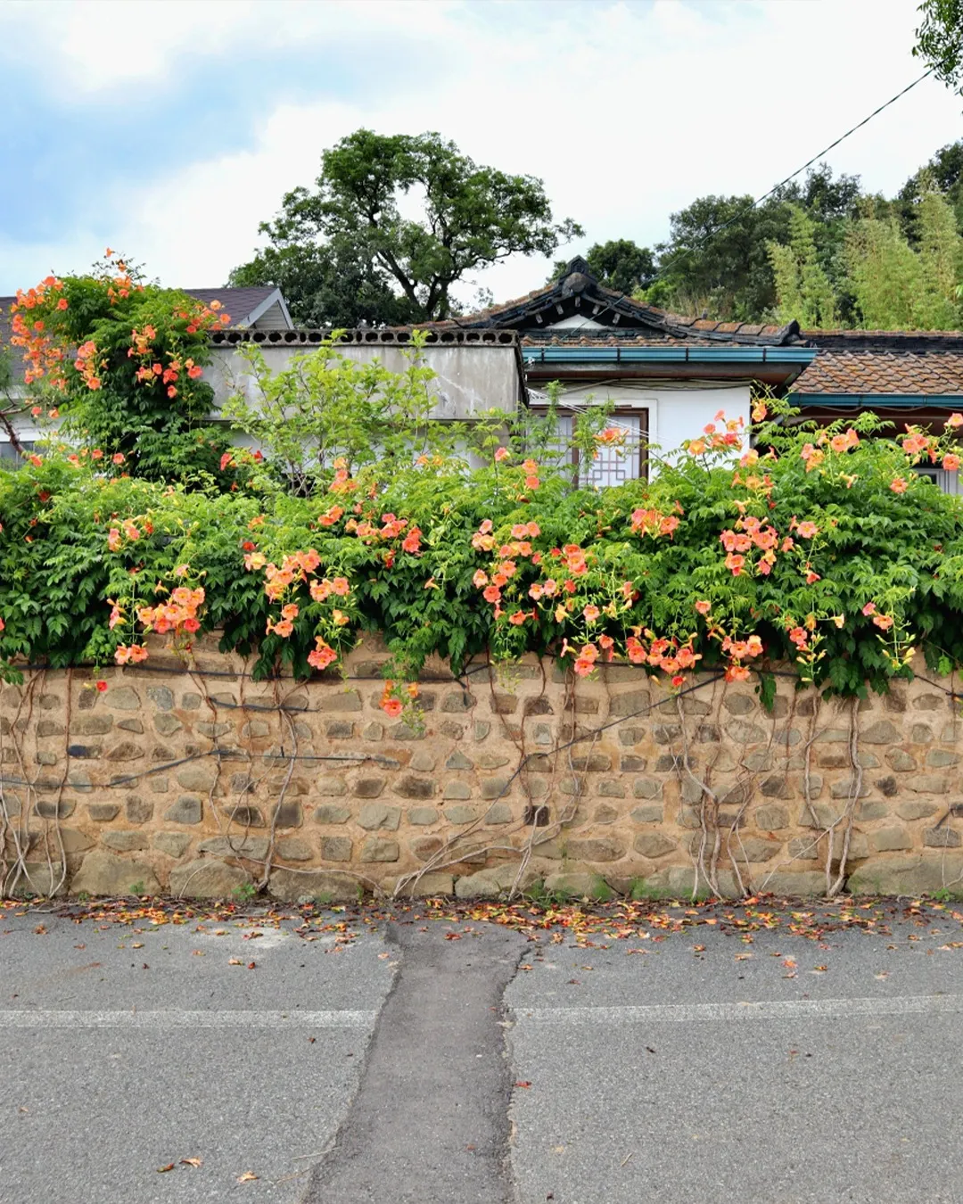 매원마을 진주댁의 담벼락에는 푸른 잎과 어우러져 피어있는 주황빛 능소화의 모습을 만나볼 수 있답니다. 봄에는 핑크빛의 벚꽃과 붉은 찔레꽃, 여름에는 멋지게 핀 연꽃과 오렌지빛의 능소화를 만나볼 수 있는데요. 4계절 내내 멋진 꽃들을 만나볼 수 있는 매원마을! 하지만 이 고택들은 주민들이 거주하고 있으므로 이 점 유의하시길 바랍니다!