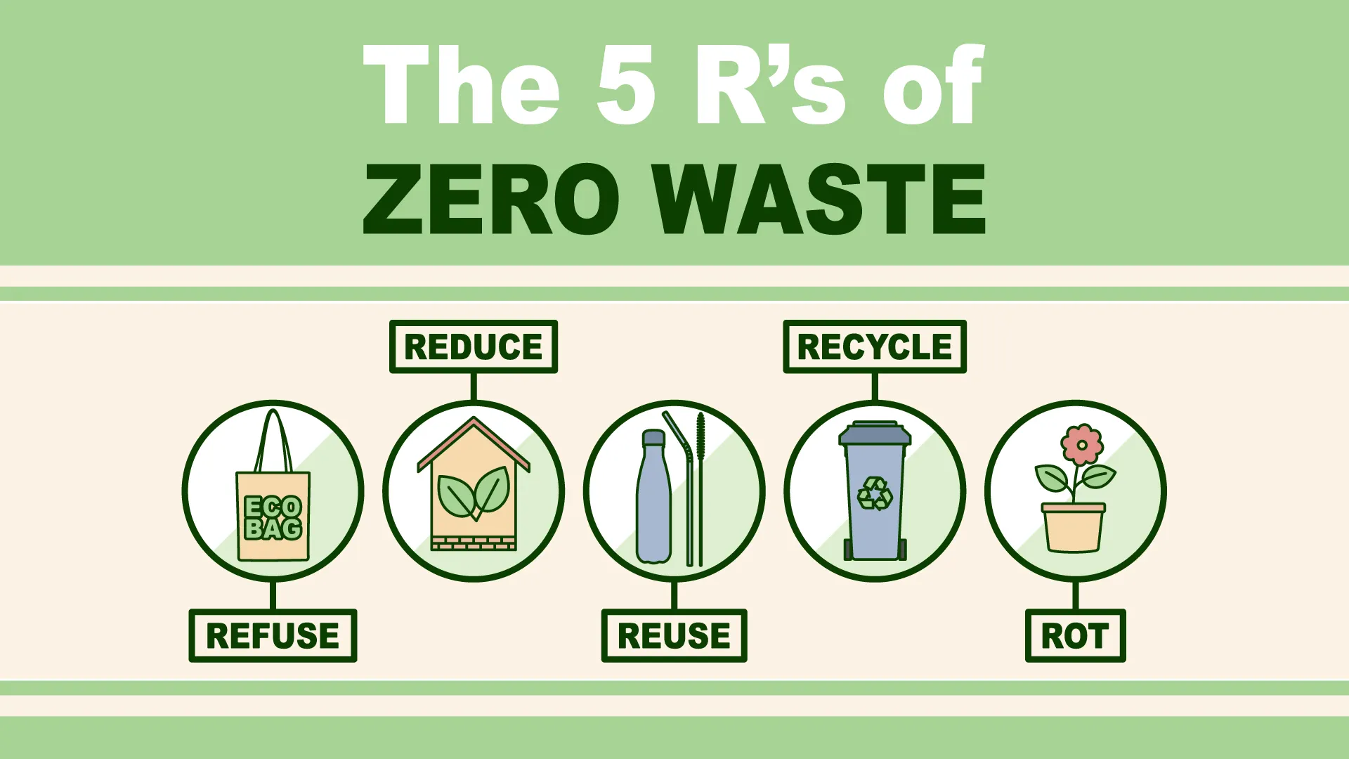 너무 잘 아시는 부분이라 한 가지만 소개해드리려고 해요. 바로 제로웨이스트에 있어서 5 R’s 라는 게 있는데요. ROT, 일반 소비에서 한 걸음 더 나아가면 RECYCLE 재활용, 제품에 사용된 소재를 녹이는 등 에너지를 투입하여 새로운 소재 및 제품을 만드는 것. 거기에서 더 나아가면 REUSE 재사용, 1회성 제품이 아닌 다회성 제품을 사용하는 것을 의미하지요. 거기에서 나아가 REDUCE 절감, 에너지, 물 등의 자원을 덜 쓰는 것을 의미합니다. 최종적으로는 REFUSE 거절. 제품을 소비하는 것 자체를 줄이는 것이랍니다. 우리는 과연 어느 R을 얼만큼 실천하고 있을까요?
