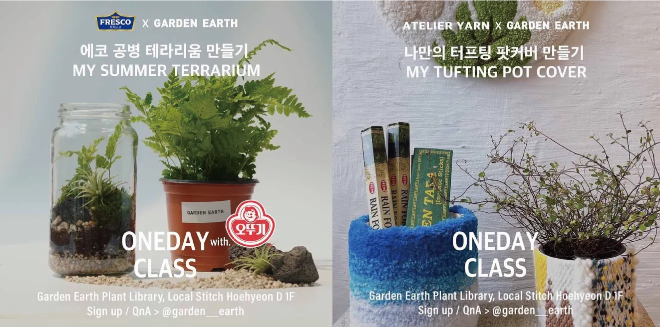 대표적으로 이번 7월 7일에는 오뚜기와 협업하여 파스타 소스 프레스코로 요리를 한 후, 남은 빈 병을 테라리움으로 재활용하는 수업을 진행했으며, 7월 8일에는 터프팅과 위빙을 활용하여 다양한 오브제를 만드는 ’아뜰리에 얀‘과 협업하여 터프팅 팟커버를 만드는 수업을 제공했습니다. 오는 8월에는 ‘페인팅 힙팟’ 원데이 클래스를 통해 자신만의 화분을 만들 수 있다고 합니다.