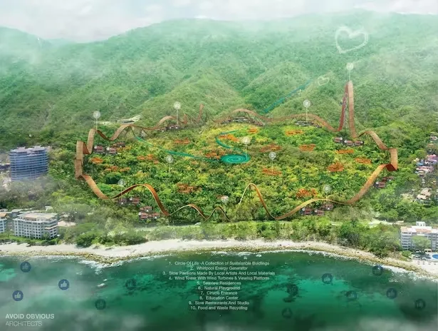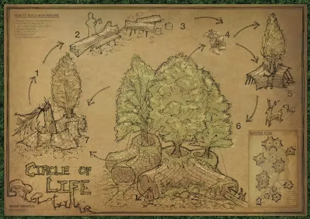 Circle of Life는, ‘혹시 건축물 자체가 살아있는 유기체처럼 자연스럽게 성장하고 꽃을 피우고 죽을 수 있다면?’, ‘영구적인 발자국을 남기는 대신 시간이 지남에 따라 변형된다면?’ 이라는 물음들을 통해 만들어진 지속가능한 건물입니다.