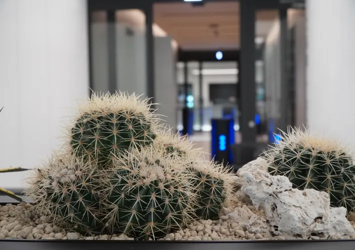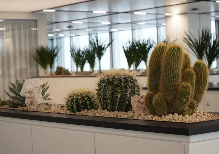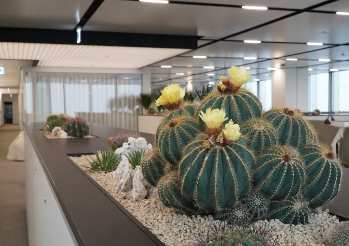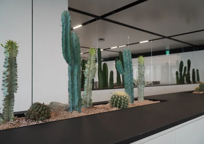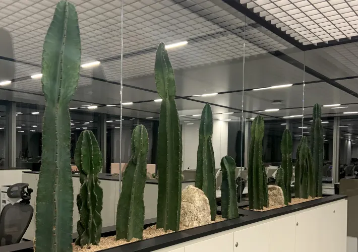 다른 공간은 게임상 사막을 연상케하는 연출을 위해 남부 지역 선인장과 실제로 함께 식재되는 관엽을 사용해 드라이하게 구성했습니다. 오피스 공간 특성상 업무에 몰두할 수 있는 환경을 위해 중대형 선인장이 자연스럽게 파티션 역할을 할 수 있도록 라인감을 주어 배치했습니다.