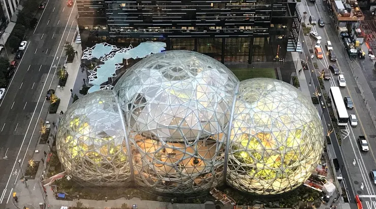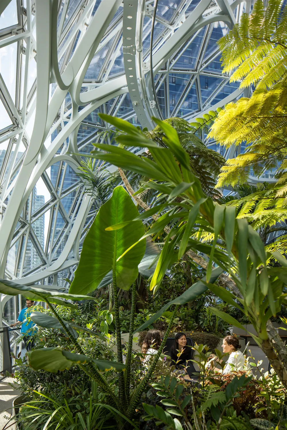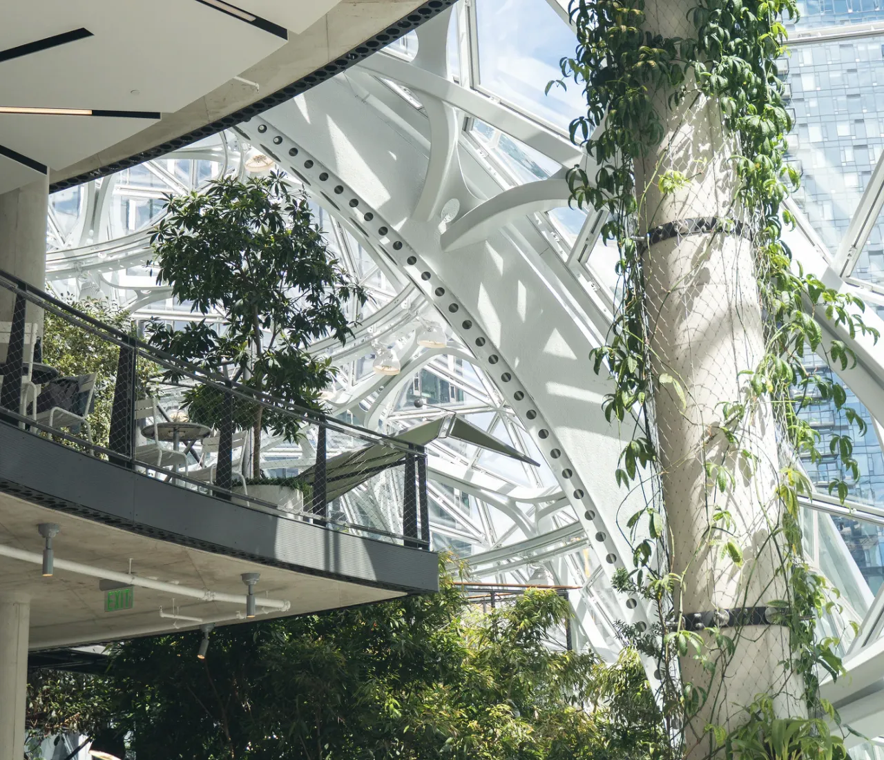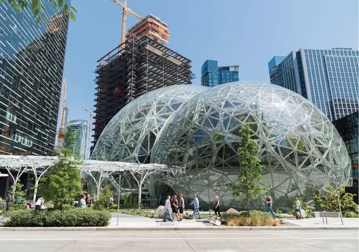 글로벌기업 아마존의 시애틀 본사 스피어(The Spheres)는 3개의 구형 온실입니다, 2018년 1월 30일에 개방되었으며, 총면적은 25,000제곱미터에 달합니다. 스피어는 바이오필릭 디자인을 적용한 대표적인 건축물입니다. 유리로 된 원형 모양의 건물 내부에 수천 종의 식물이 있습니다. 건물이 열대우림인지 사무실인지 헷갈릴 정도로 친화적이며 정글, 현수교, 다양한 기후 존, 물고기가 있는 수족관까지 조성되어 있습니다.
