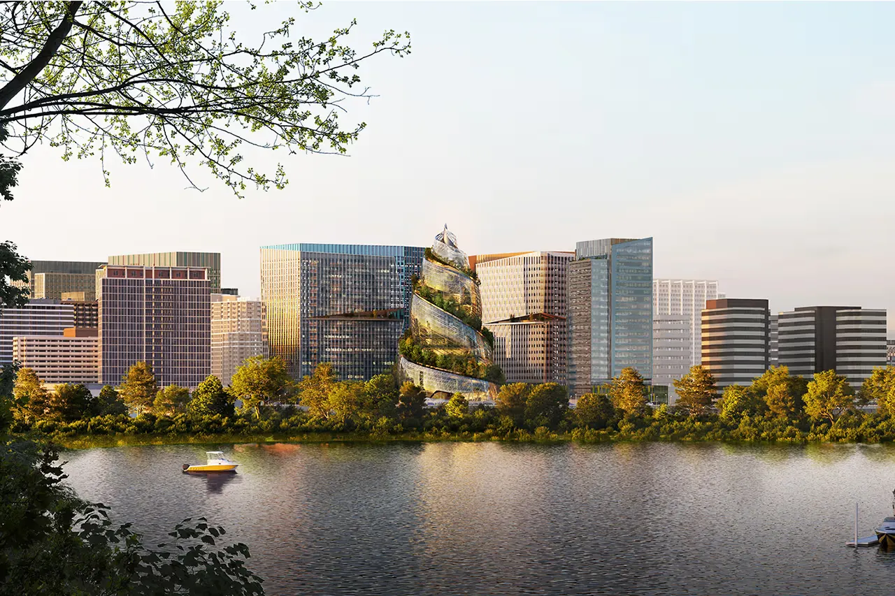 아마존이 스피어에 이어 두 번째로 설립할 예정인 버지니아 알링턴 본사 'The Helix'도 바이오필릭 디자인이 적용된 건축물입니다. 22층 높이의 나선형 건물로, 내부에는 2,500여 종의 식물과 나무가 심어져 있습니다. 중앙에는 자연적인 정원이 자리하고 있습니다. 수직 숲을 표방하는 이 건물은 버지니아 블루리지 산맥의 하이킹 코스를 형상화하기 위해 이 산에 서식하는 식물 종을 배치할 계획이라고 합니다. 나뭇잎이 나선형으로 펼쳐진 듯한 디자인으로 도시 속에서도 자연의 아름다움을 살림으로써 직원들에게 휴식과 창의성을 제공하고 있습니다.