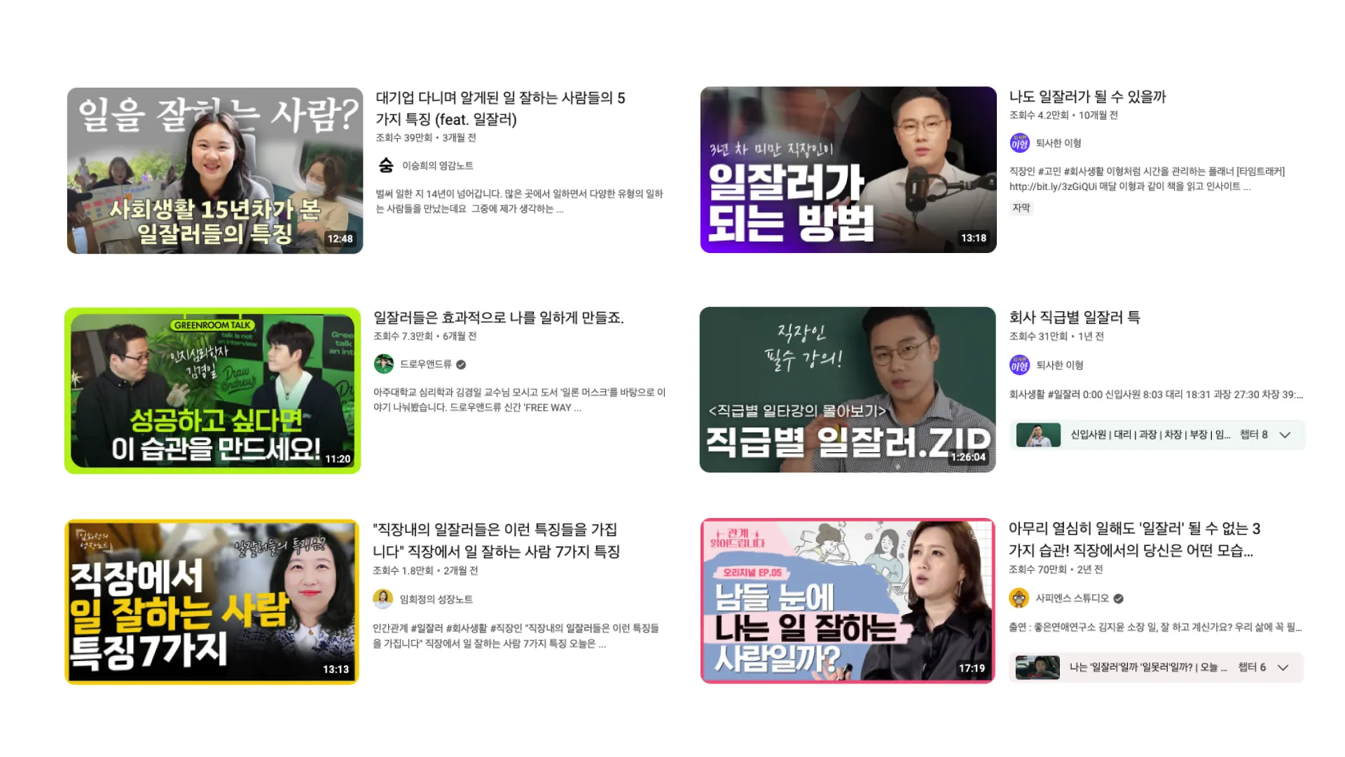 일상에서도 흔히 쓰이며 너도 나도  일잘러가 되길 희망 하기 때문에 유튜브에서도 ‘일잘러의 특징’, ‘일잘러가 되는 방법’ 등 다양한 콘텐츠가 아직까지도 활발하게 만들어지고 있습니다.
