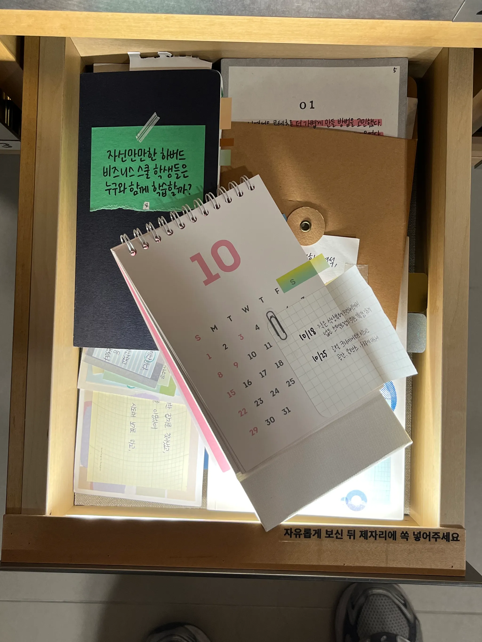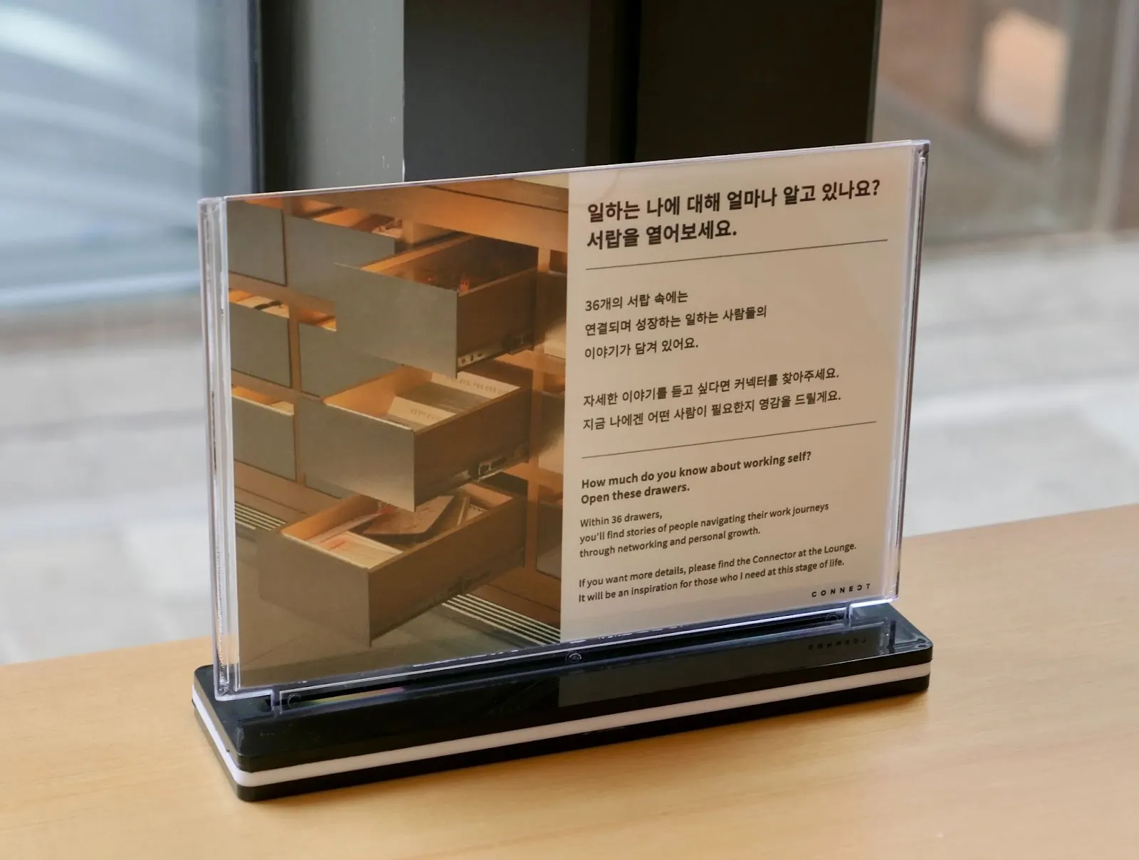 일하는 나에 대해서 아는 시간을 가졌다면 이제는 저와 같은 고민을 하는 사람들 혹은 이미 그 고민을 거쳤던 사람들이 준비한 전시를 볼 수 있었습니다. 전시는 오른쪽에 위치한 서랍을 하나하나 열어보며 일잘러 선배님들의 조언과 경험을 엿 볼 수 있었습니다.