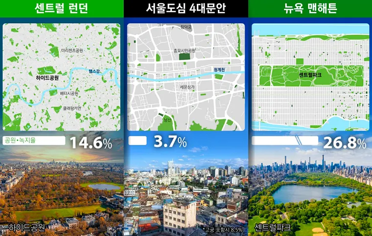 앞서 살펴 보았듯, 울창한 산림을 보존하는 것도 매우 중요한 일이지만, 우리가 살고 있는 도시 내 녹지화도 그에 못지 않게 중요한 일입니다. 현재 서울 도심의 공원, 녹지 비중은 전체 면적의 3.7%에 불과합니다. 미국 뉴욕 맨해튼 (26.5%), 영국 센트럴 런던(14/5%) 등 세계 대도시에 비교하면 녹지율이 현저히 낮습니다. 다른 도시들은 도심의 마천루와 풍부한 녹지를 동시에 확보하는 밑그림을 가지고 도심 개발을 했다면 서울은 녹지확보에 대한 고민 없이 개발이 이뤄졌기 때문입니다.