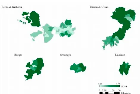 대도시 별 녹지 공간 분포도 (*논문발췌)