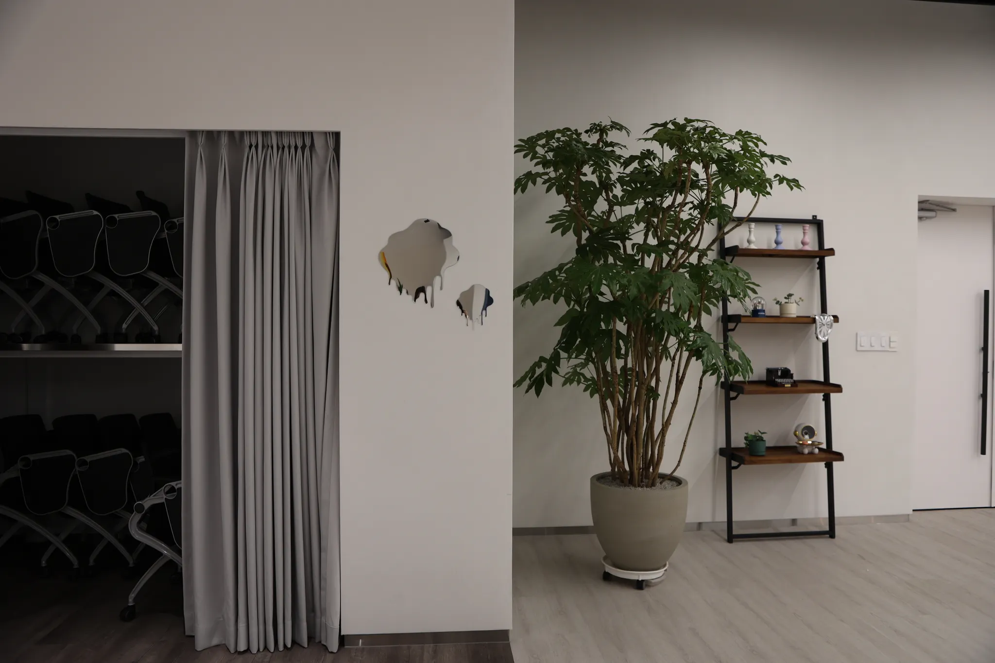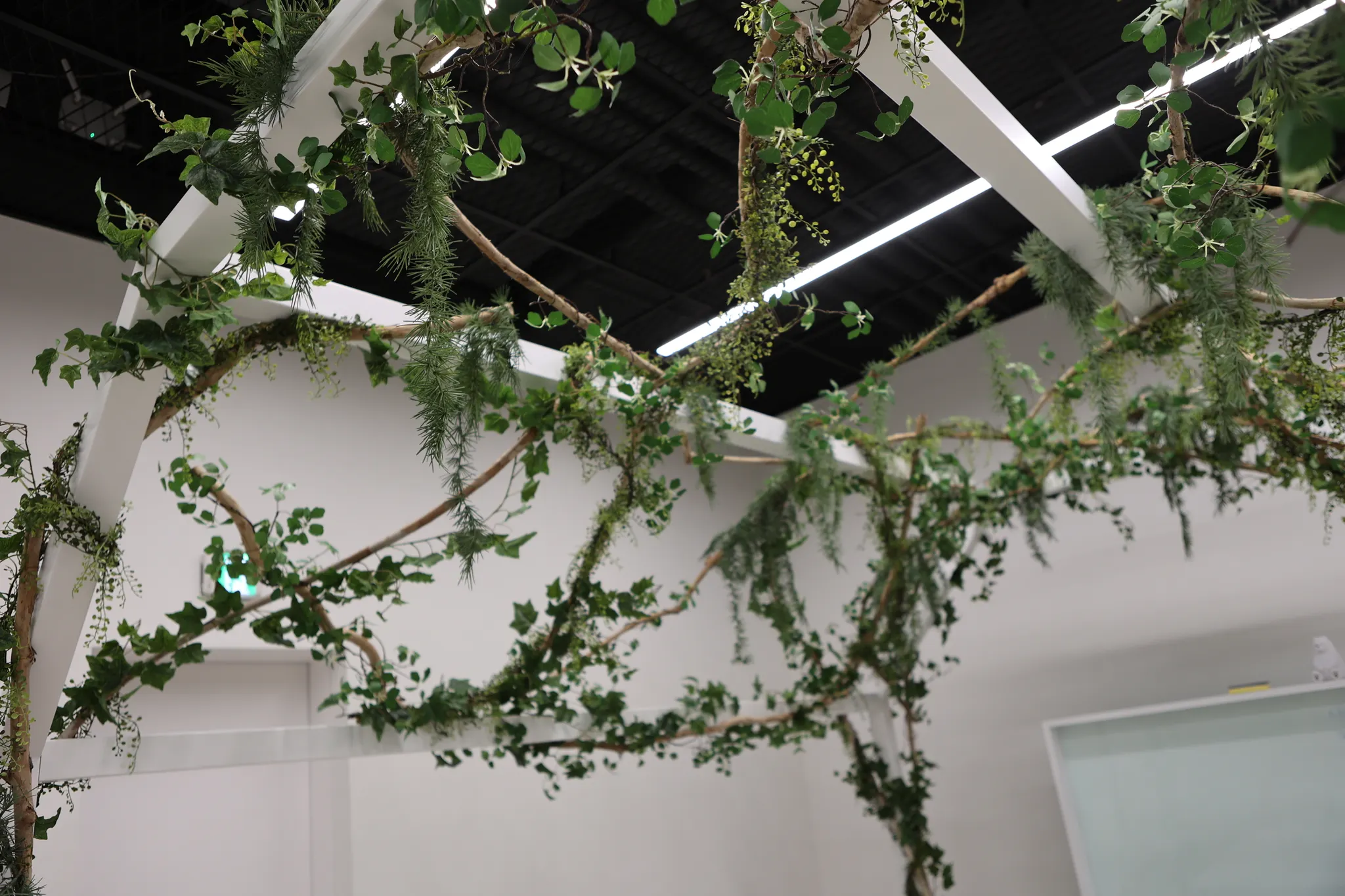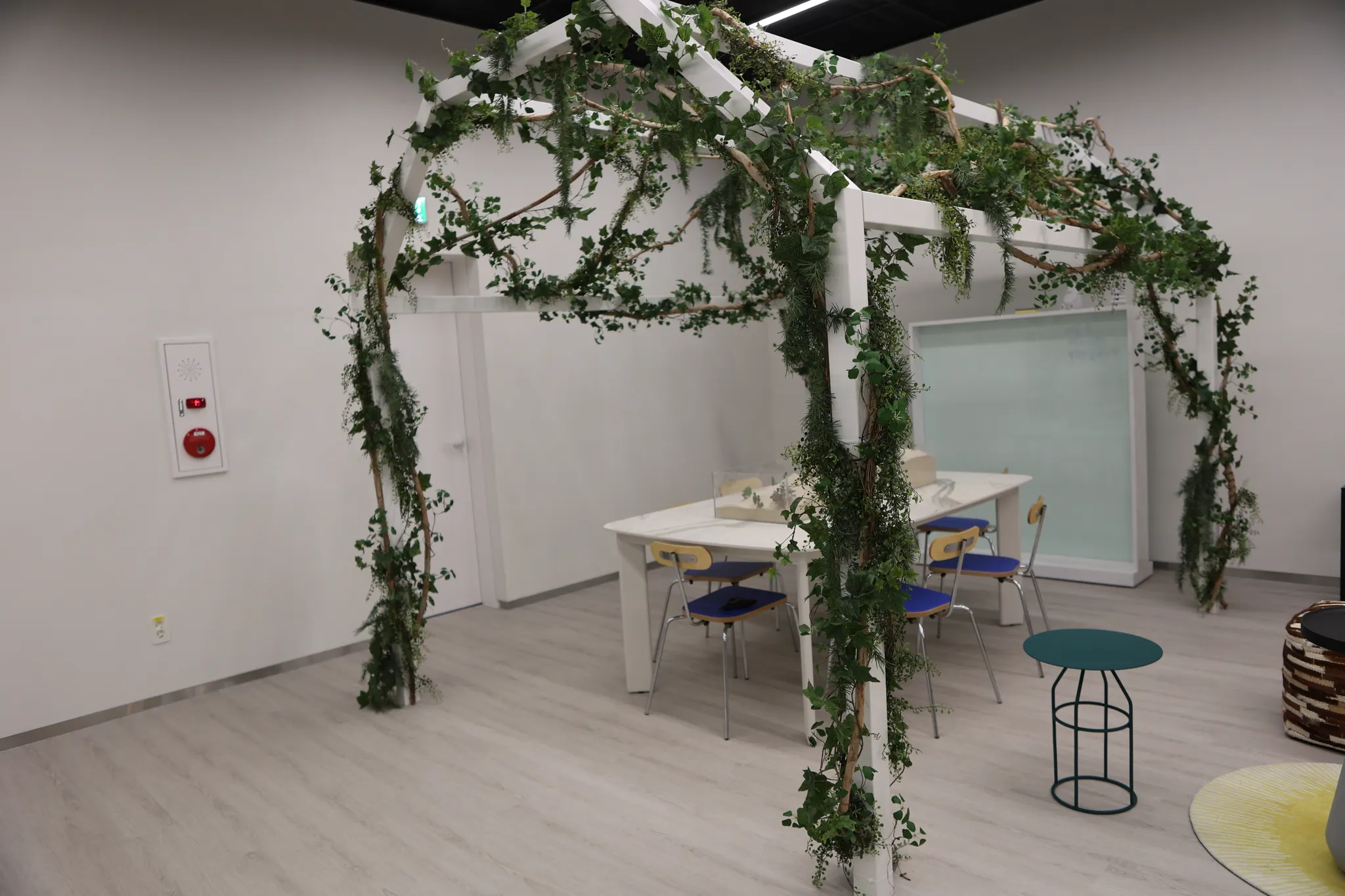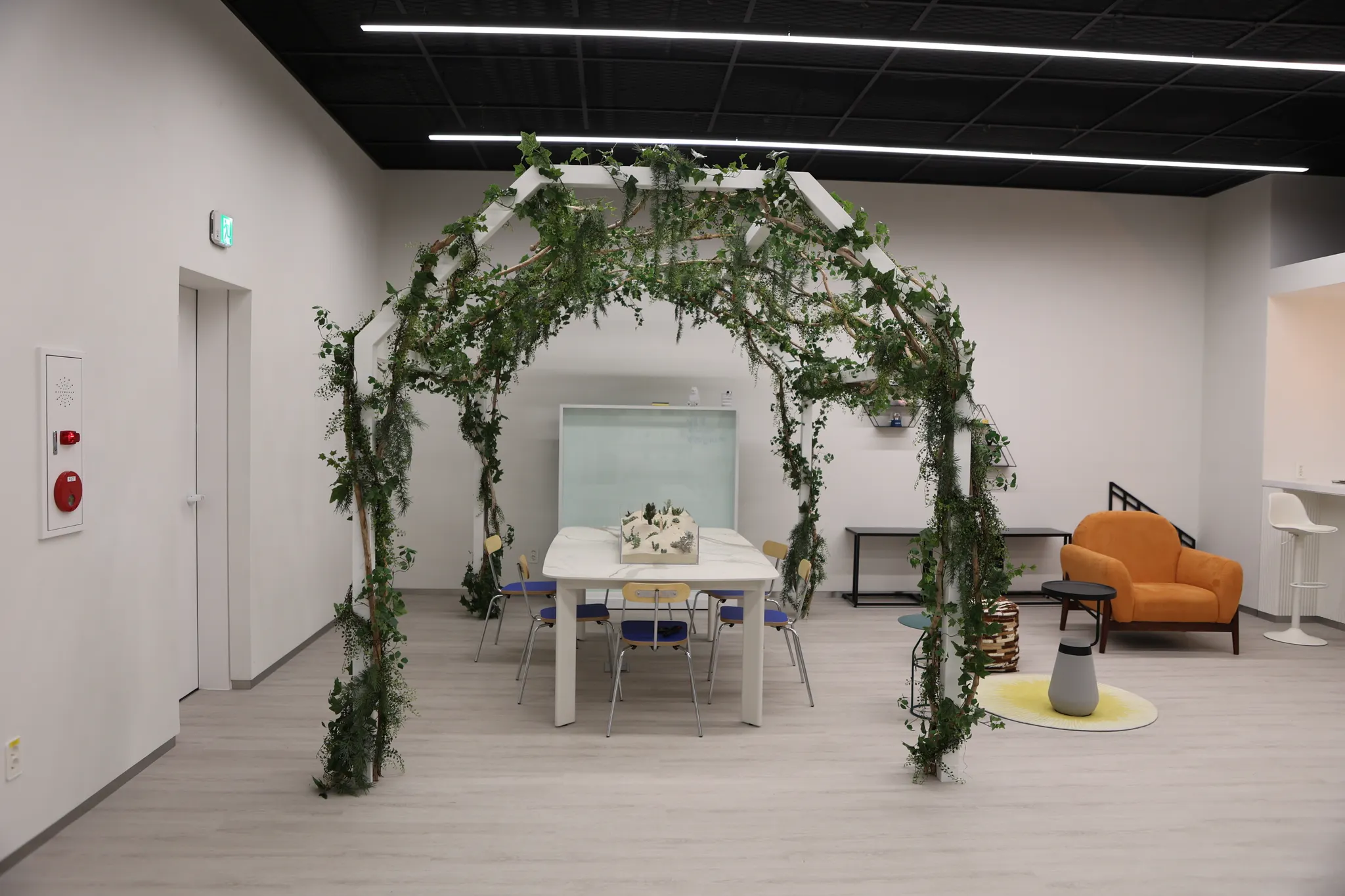 전체적으로 화이트 톤인 공간에 컬러감 있는 가구와 아크릴 오브제를 연출했습니다. 철제 구조물에는 넝쿨을, 테이블 옆쪽에는 화분을 배치해서 행잉을 더욱 자연스럽게 합니다.