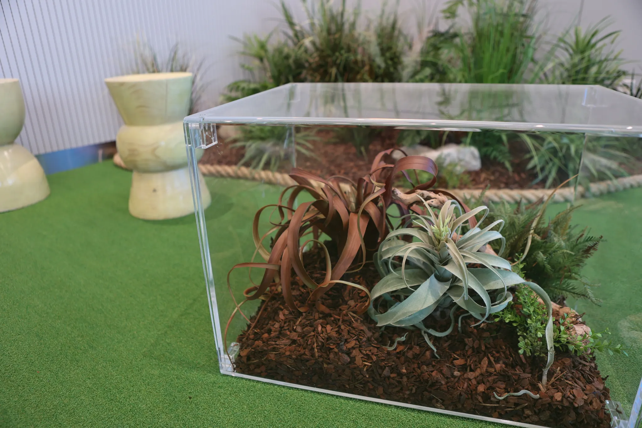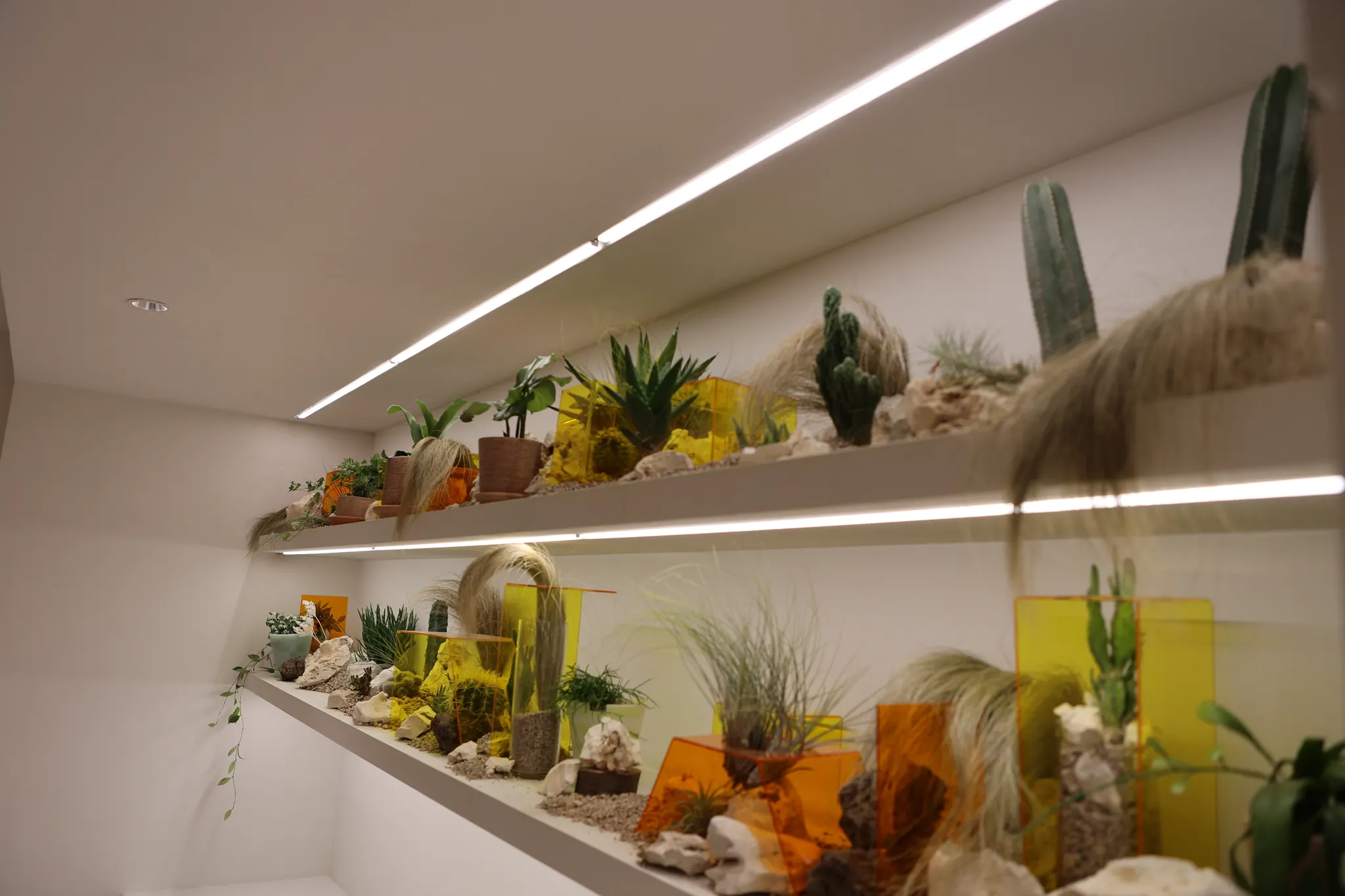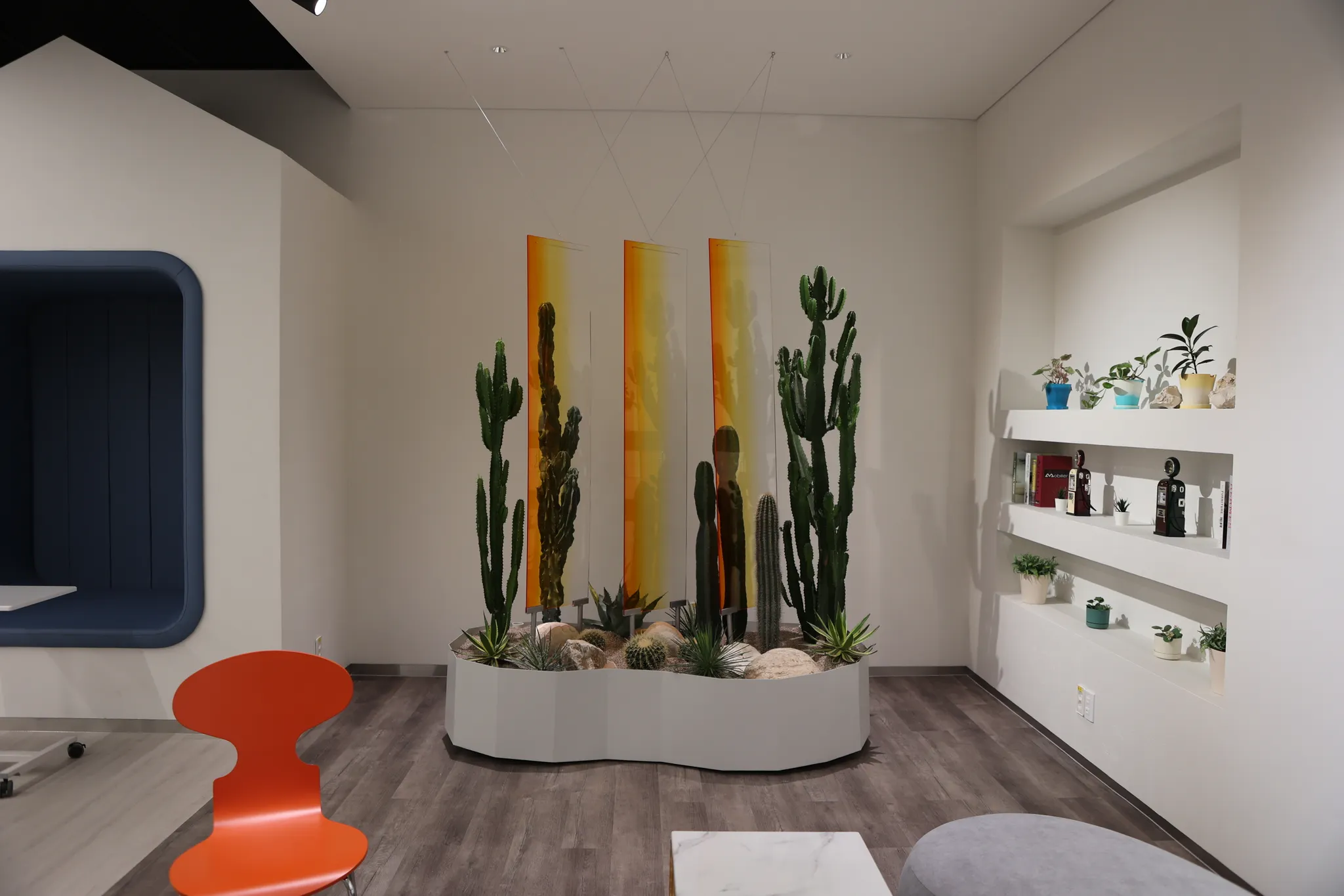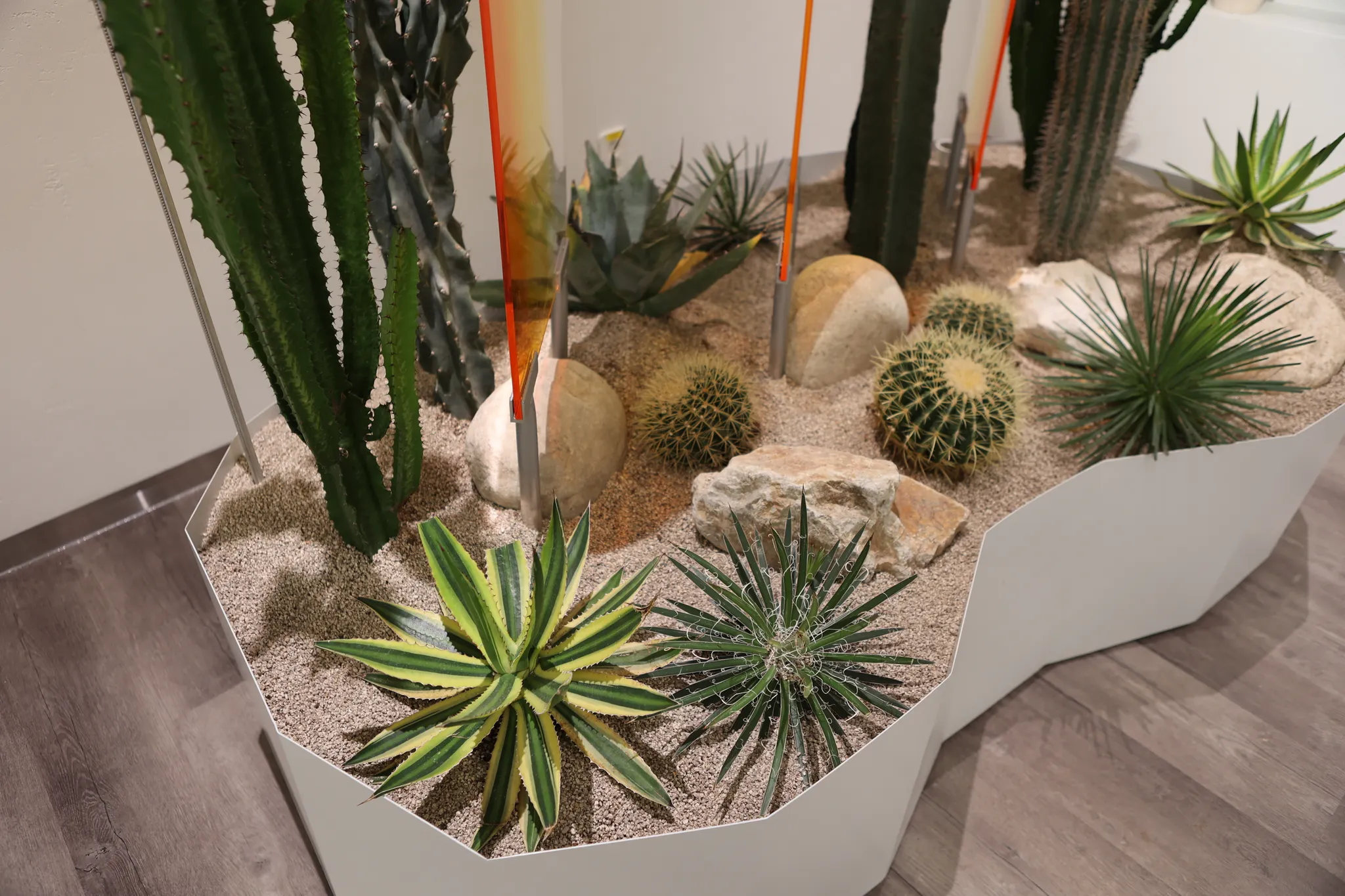 선인장을 식재하는 플랜트 박스 역시 비정형 형태로 제작했습니다. 연출 과정에서는 마사를 활용해 드라이한 느낌을 더하고 아크릴 오브제를 활용해 팝한 느낌을 주었습니다. 아크릴 역시 여러 가지 색을 겹겹이 레이어드해서 더욱 입체적으로 보이도록 했습니다.