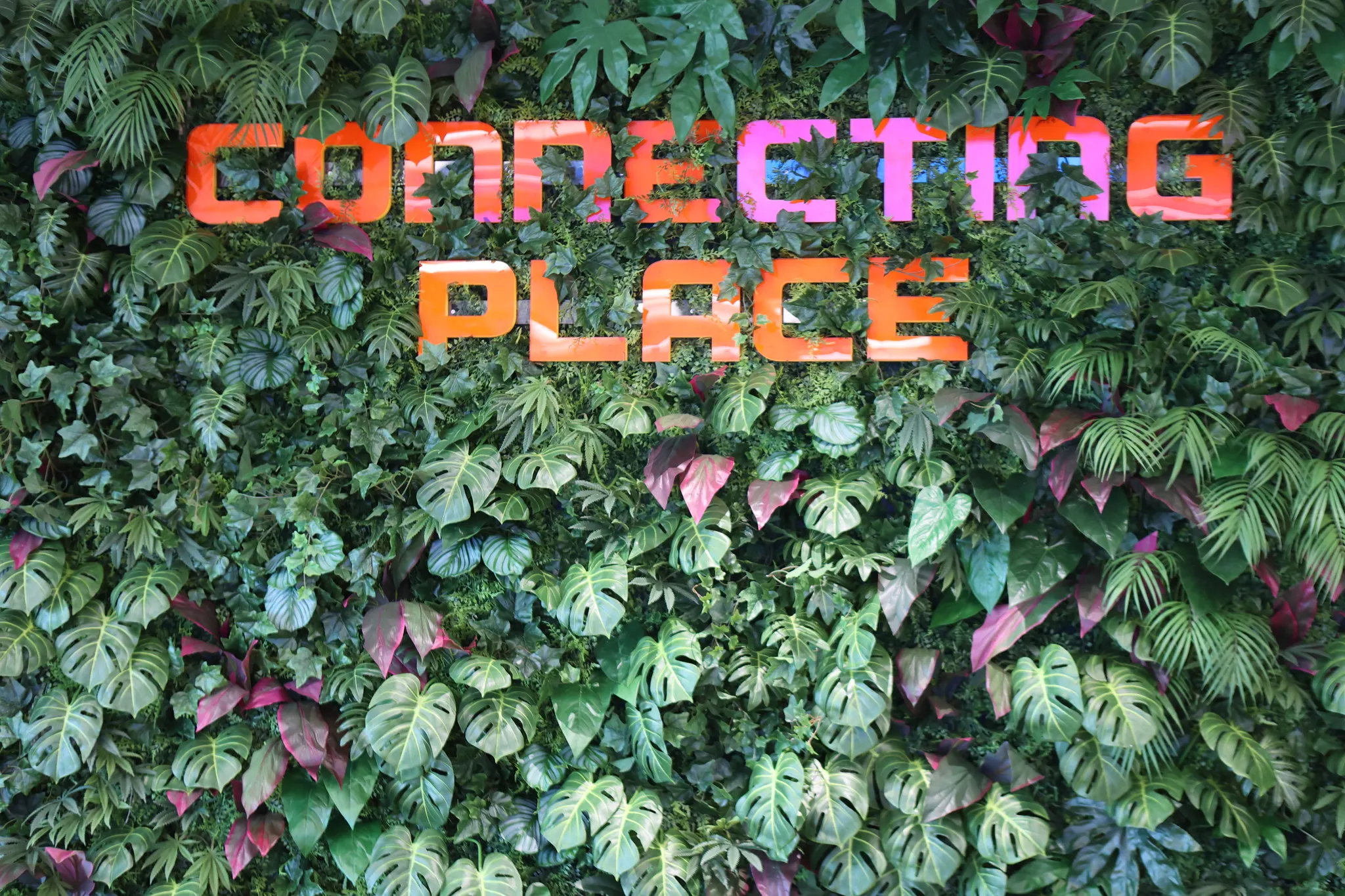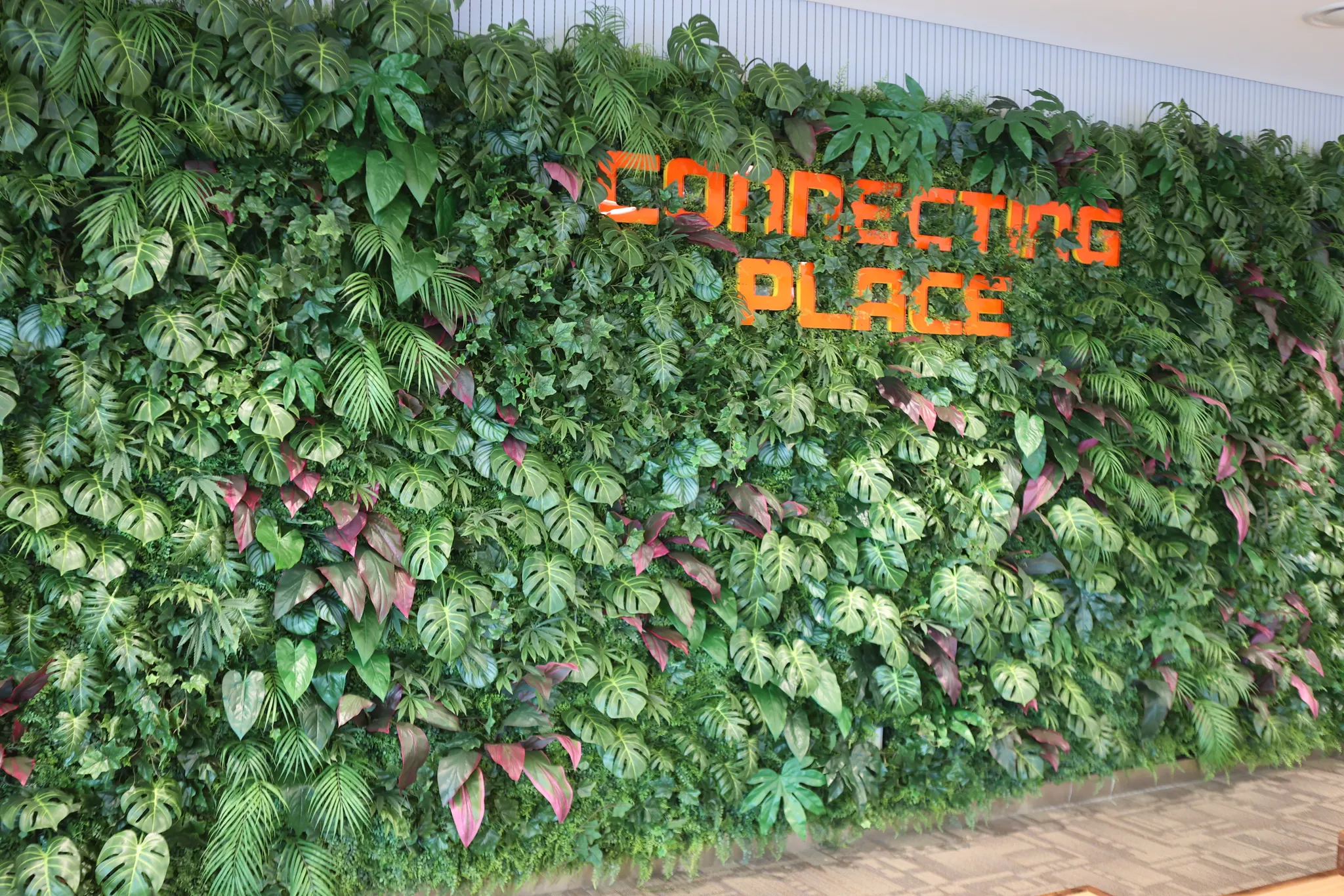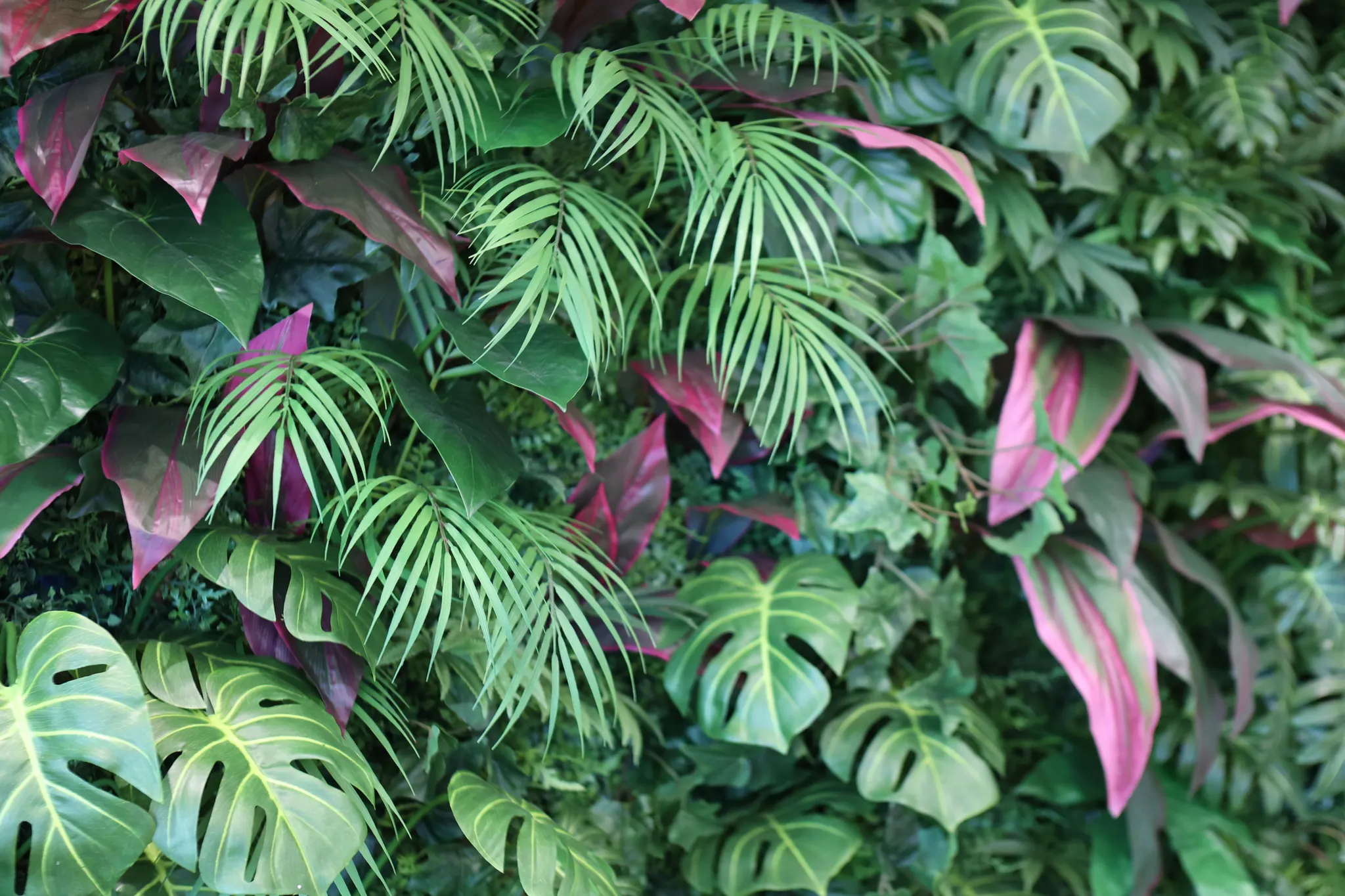 몬스테라와 야자류 그리고 붉은색 포인트 컬러의 조화를 사용해 플랜트월에도 팝한 무드가 느껴질 수 있도록 했습니다.