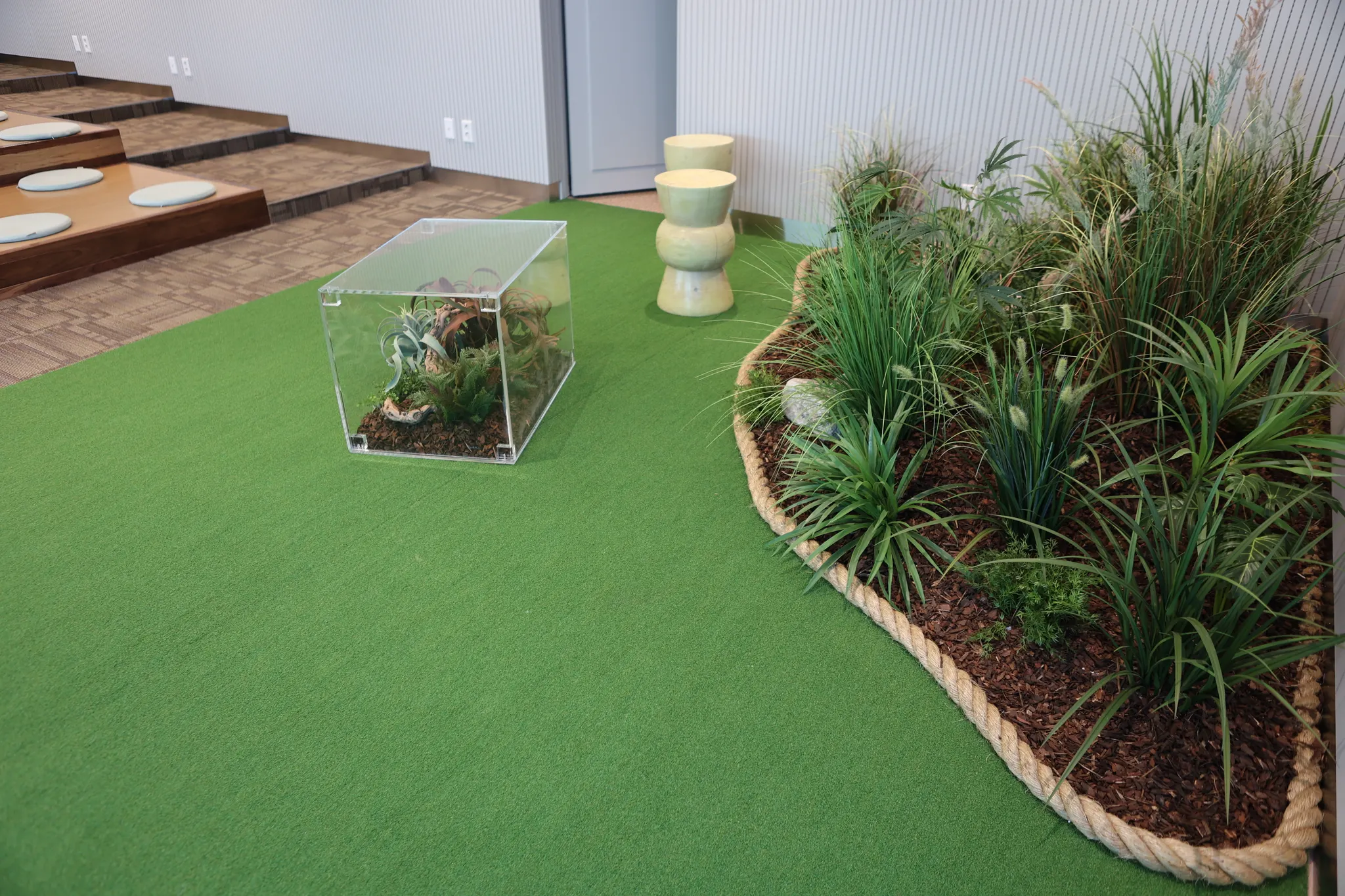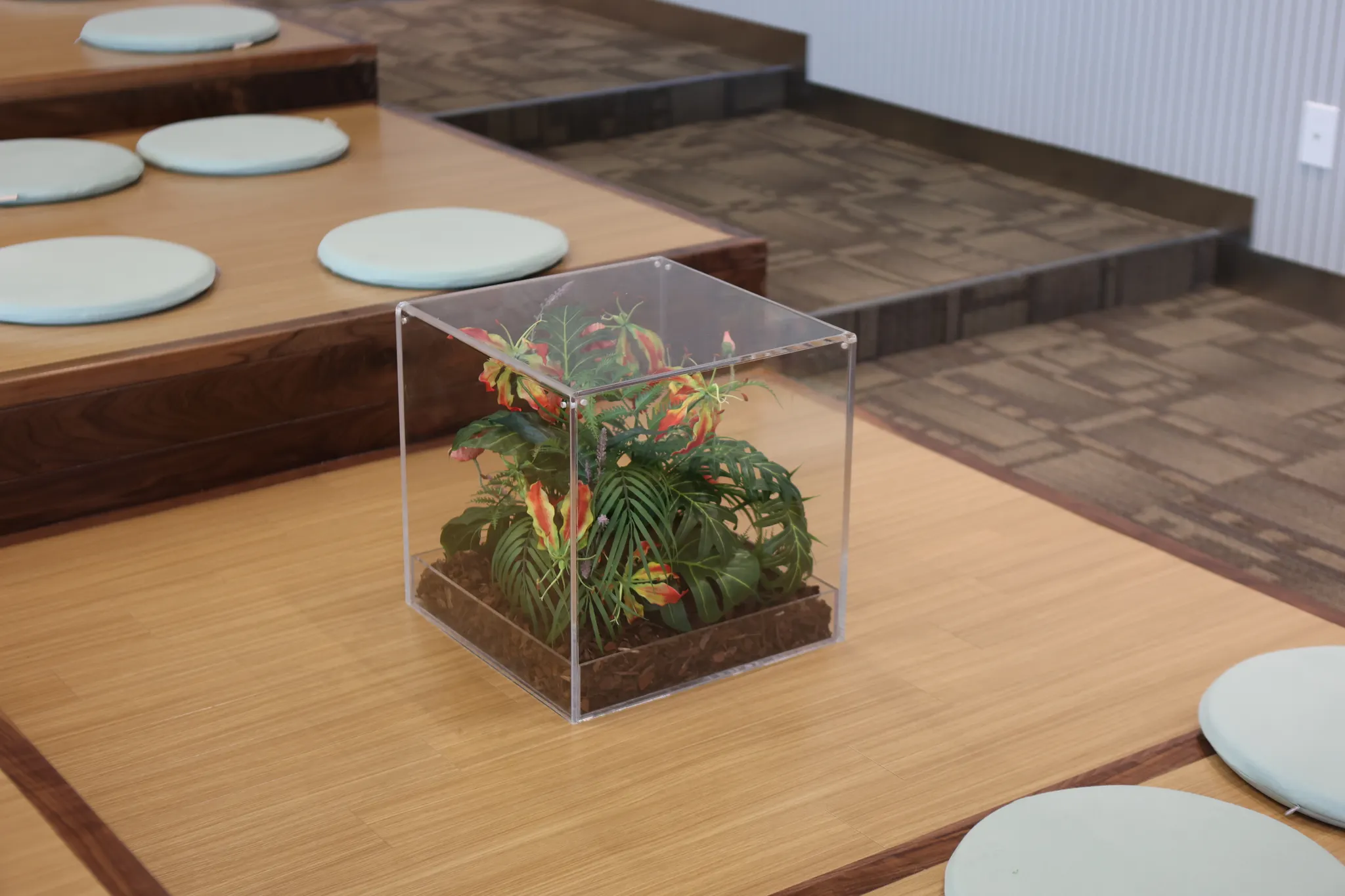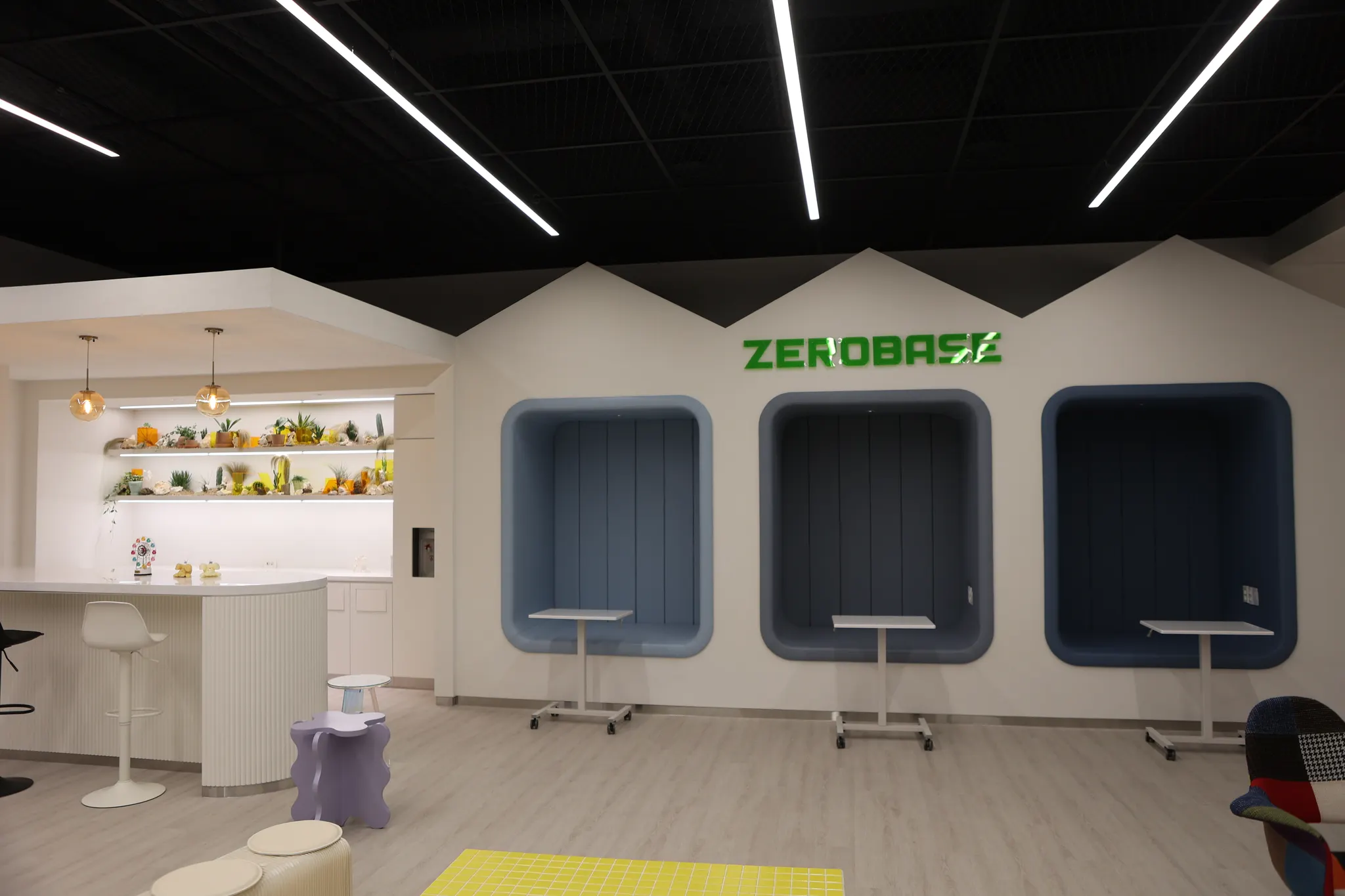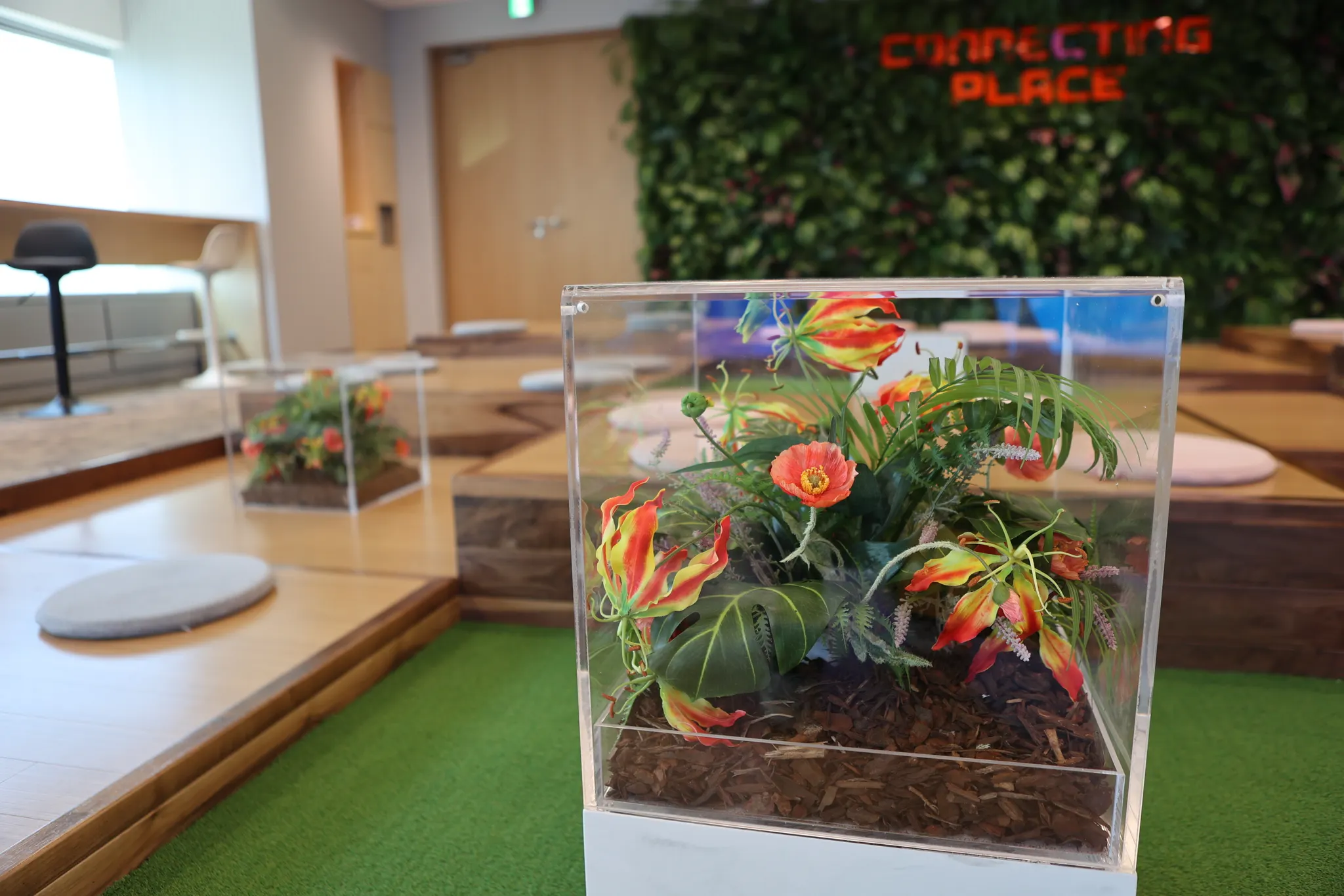 아이디어 생성을 위한 공간으로 나무 의자와 아크릴 테이블을 배치했습니다. 아크릴 내부에도 플랜테리어로 연출해 무한의 아이디어를 창출해 낼 수 있는 공간이 되도록 신경 썼습니다.